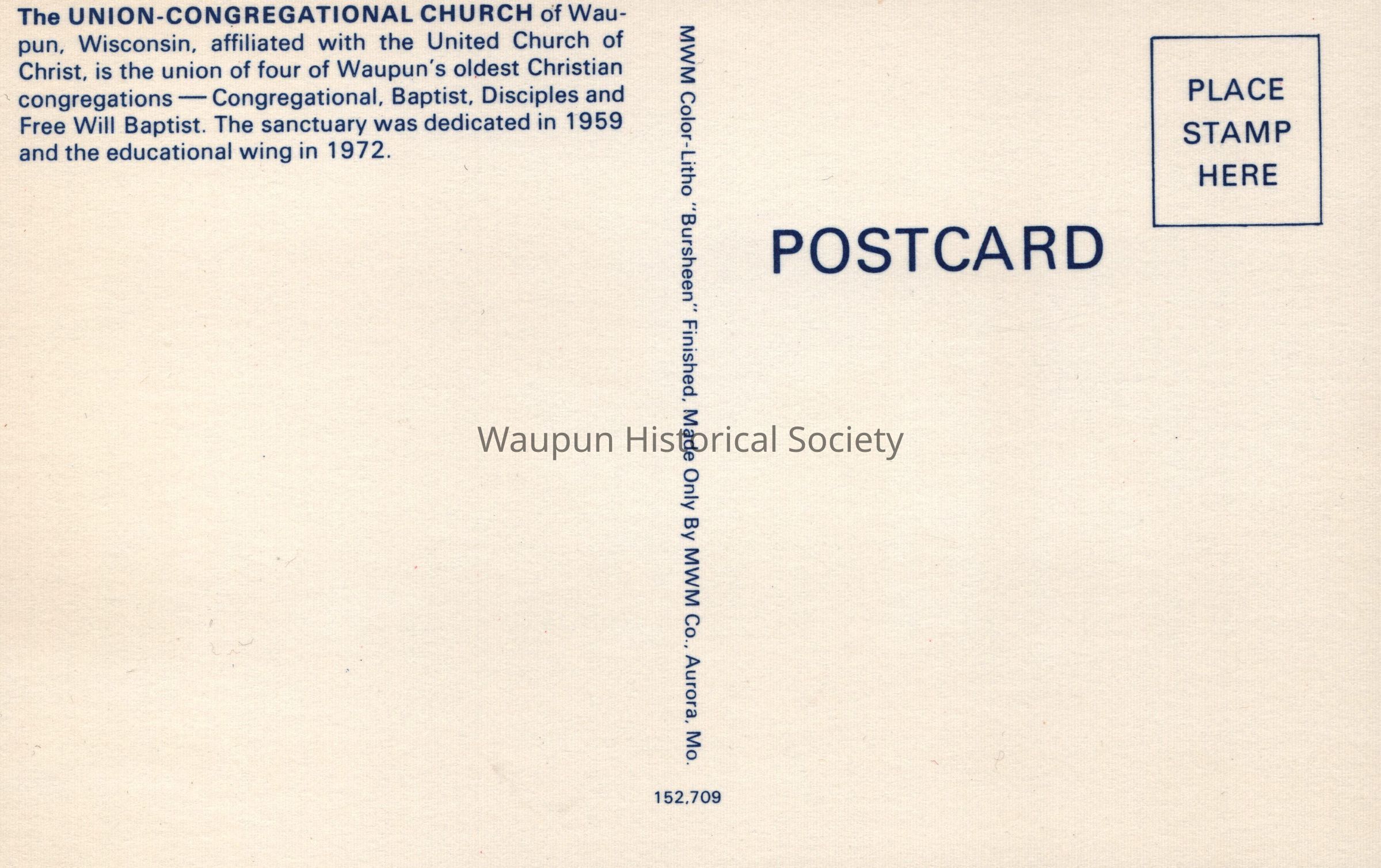 Postcard, Church, Union-Congregational, UCC. Waupun Churches. This scan of a color picture postcard comes from Jim Laird's personal collection. On the back is printed: "The UNION-CONGREGATIONAL CHURCH of Waupun, Wisconsin affiliated with the United Church of Christ, is the union of for of Waupun's oldest Christian congregations- Congregation, Baptist, Disciples and Free Will Baptist. The sanctuary was dedicated in 1959 and the educational wing in 1972.Acquisition