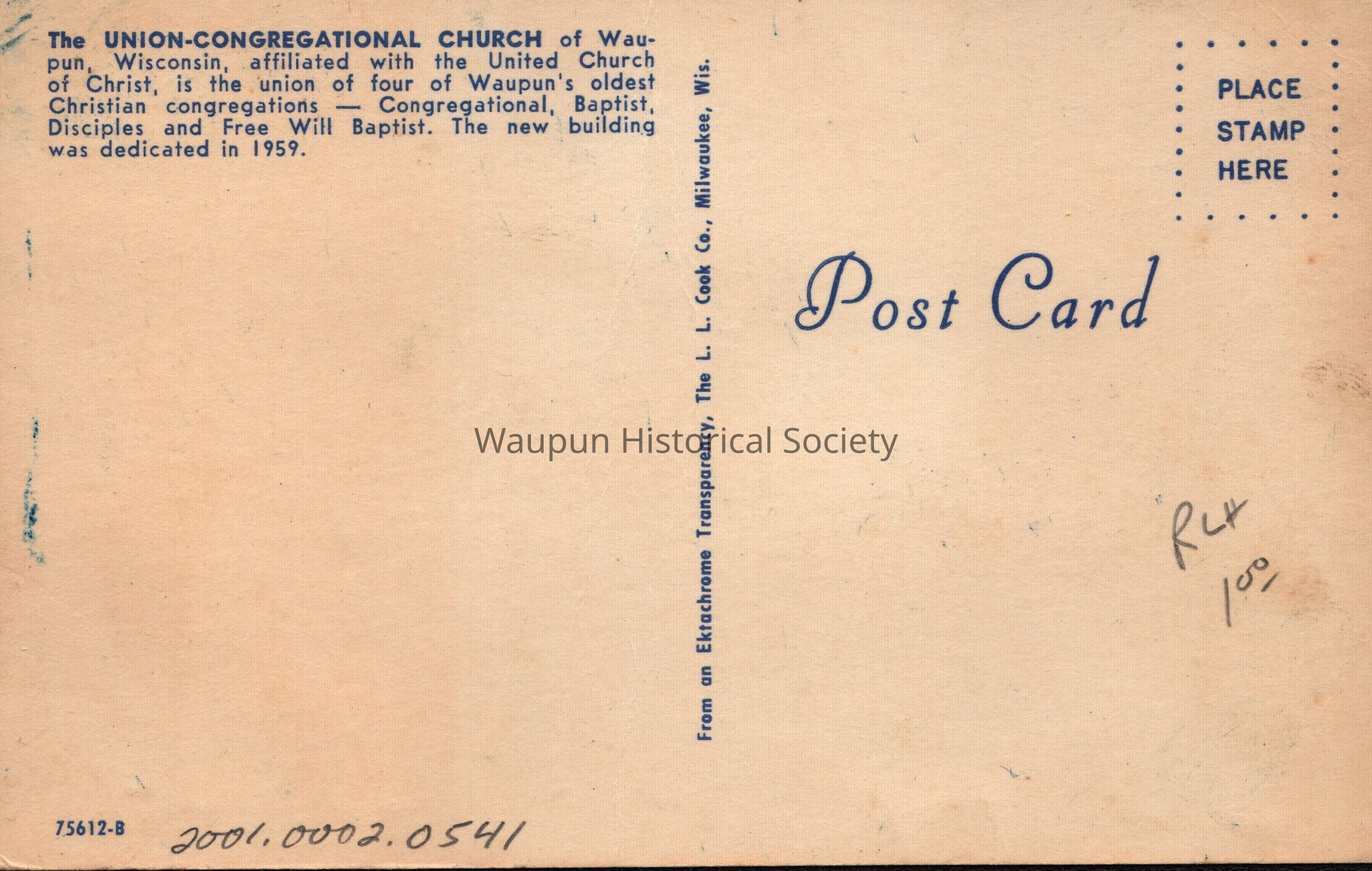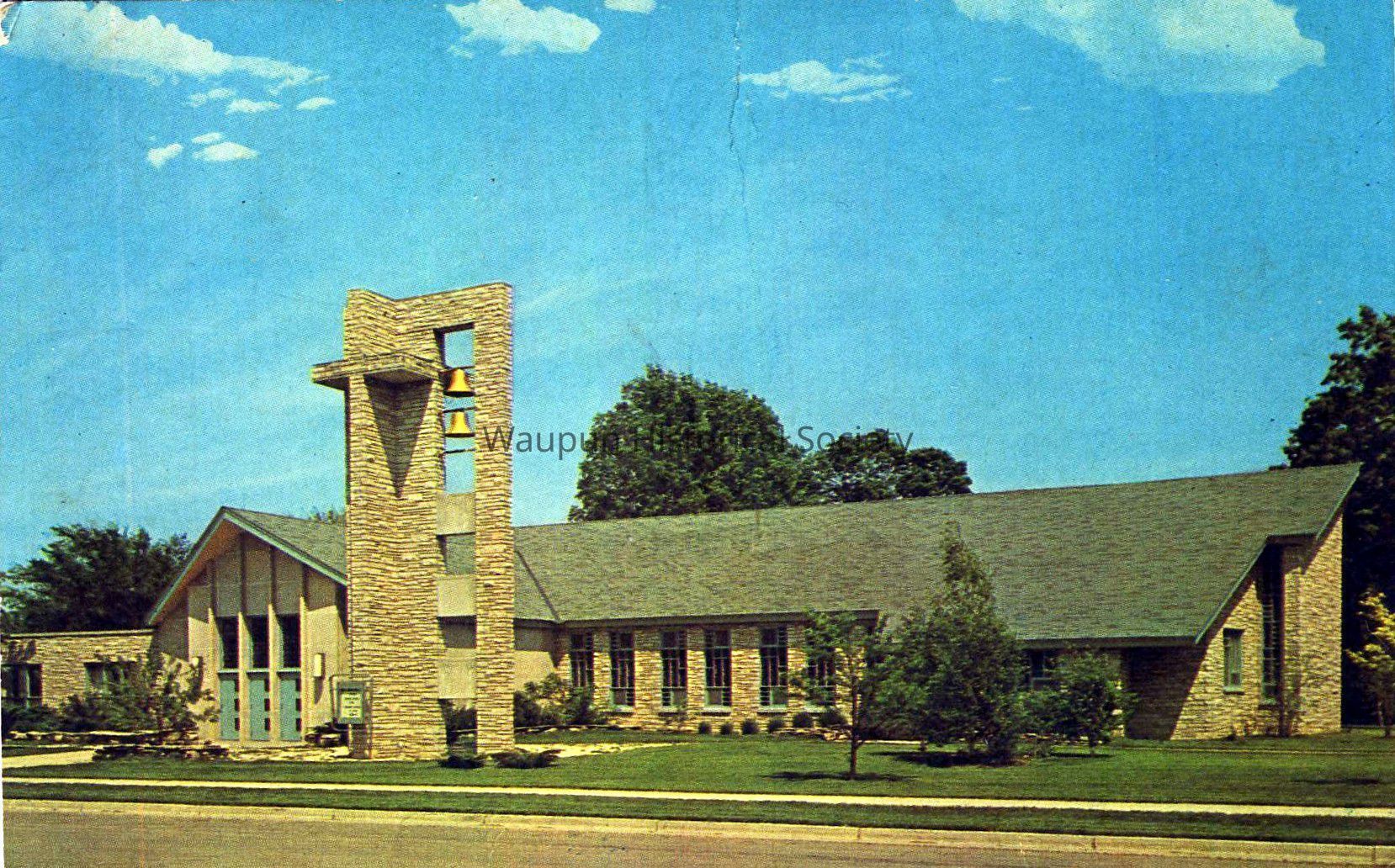 Postcard, Church, Union-Congregational, UCC, #75612-B. Waupun Churches. This scan of a color picture postcard comes from Jim Laird's personal collection. On the back is printed: "The UNION-CONGREGATIONAL CHURCH of Waupun, Wisconsin affiliated with the United Church of Christ, is the union of for of Waupun's oldest Christian congregations- Congregation, Baptist, Disciples and Free Will Baptist. The new building was dedicated in 1959.Acquisition