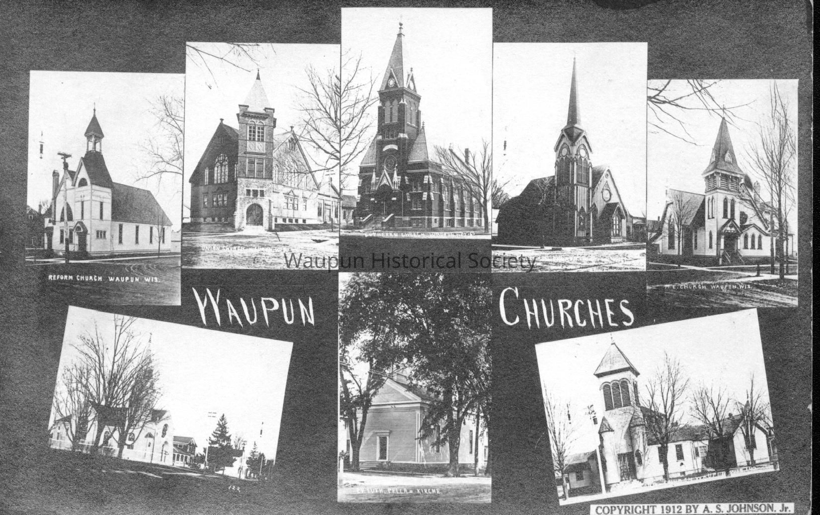 Waupun Churches. Postcard from 1912 showing eight Waupun Churches of that time. Reform Church, Union Church, Immanuel Lutheran Church, Episcopal Church, Methodist Church, Catholic Church, Lutheran Pella Church and Congregational ChurchAcquisition