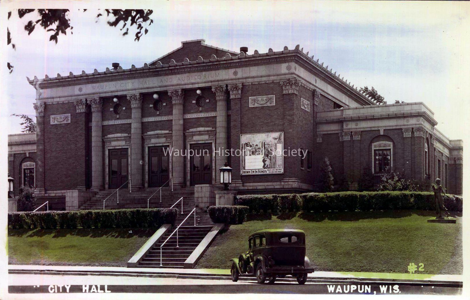 Postcard, City Hall, and Auditorium, #2. There are numerious historical files about the City Hall and Auditorium. The building was built on the site of the Union Church (of Union-Congregational Church) and was completed in 1928. At that time it not only contained the City Offices and the Auditorium, but also contained the fire department. In 1985 the planning was started for the construction of the Safety Building. With the completetion of the Safety Building the fire department left the building and the city offices were moved downstairs. There is a more complete history in the 1989 Waupun History.