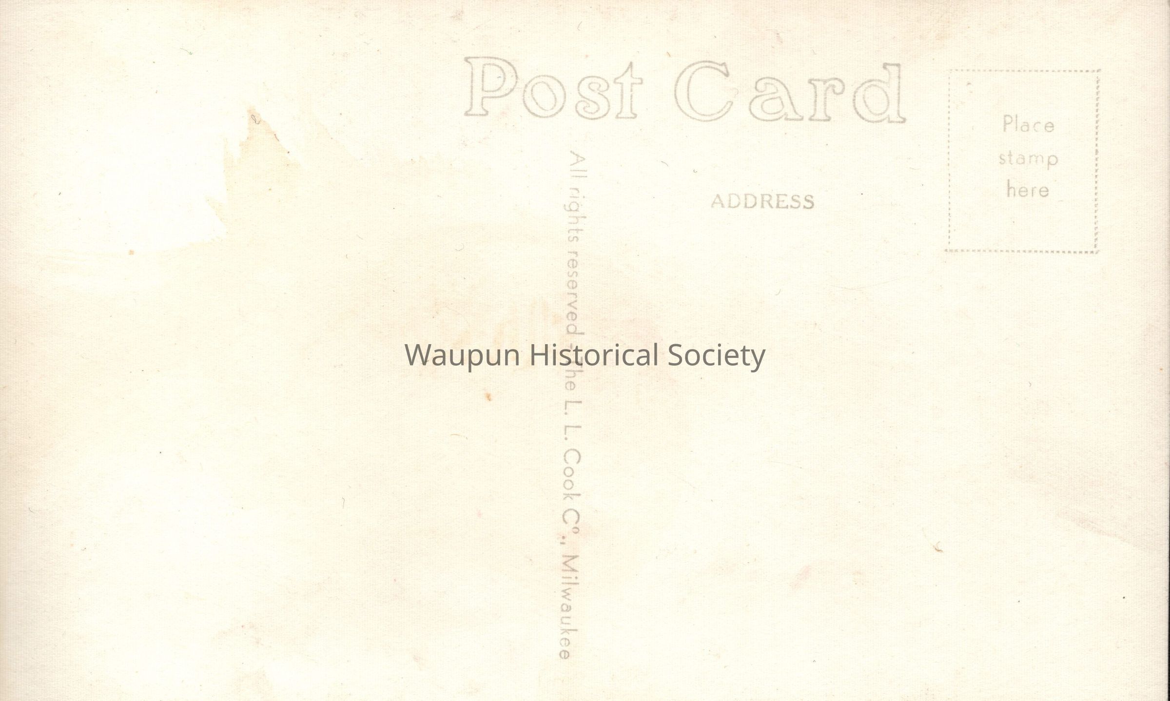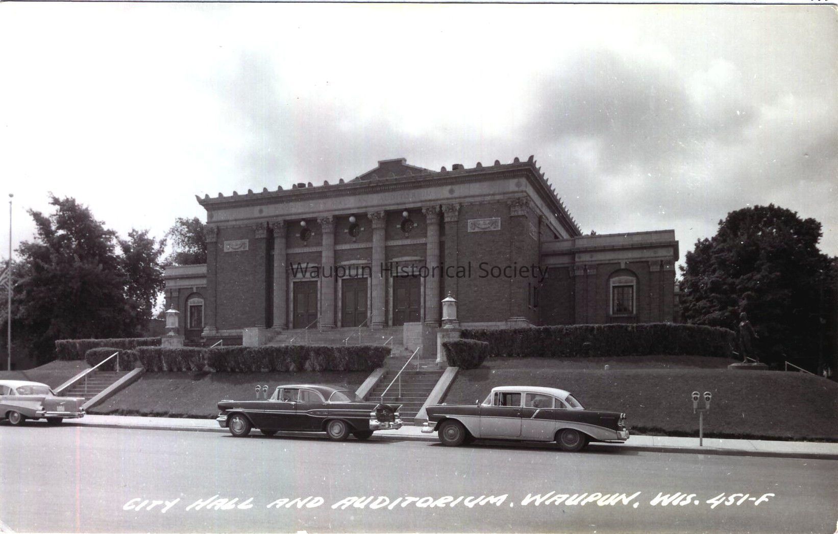 Postcard, City Hall, and Auditorium, #451-F. There are numerious historical files about the City Hall and Auditorium. The building was built on the site of the Union Church (of Union-Congregational Church) and was completed in 1928. At that time it not only contained the City Offices and the Auditorium, but also contained the fire department. In 1985 the planning was started for the construction of the Safety Building. With the completetion of the Safety Building the fire department left the building and the city offices were moved downstairs. There is a more complete history in the 1989 Waupun History.
