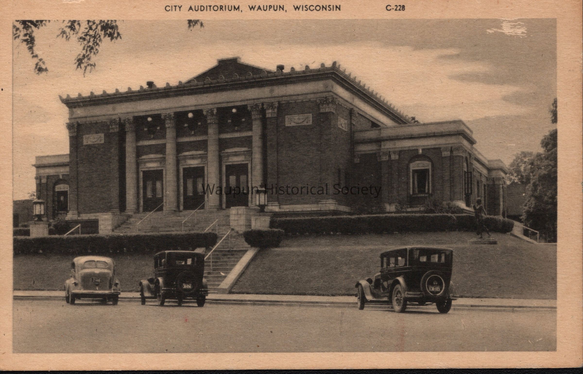 Postcard, City Hall, and Auditorium, #C-228. There are numerious historical files about the City Hall and Auditorium. The building was built on the site of the Union Church (of Union-Congregational Church) and was completed in 1928. At that time it not only contained the City Offices and the Auditorium, but also contained the fire department. In 1985 the planning was started for the construction of the Safety Building. With the completetion of the Safety Building the fire department left the building and the city offices were moved downstairs. There is a more complete history in the 1989 Waupun History.