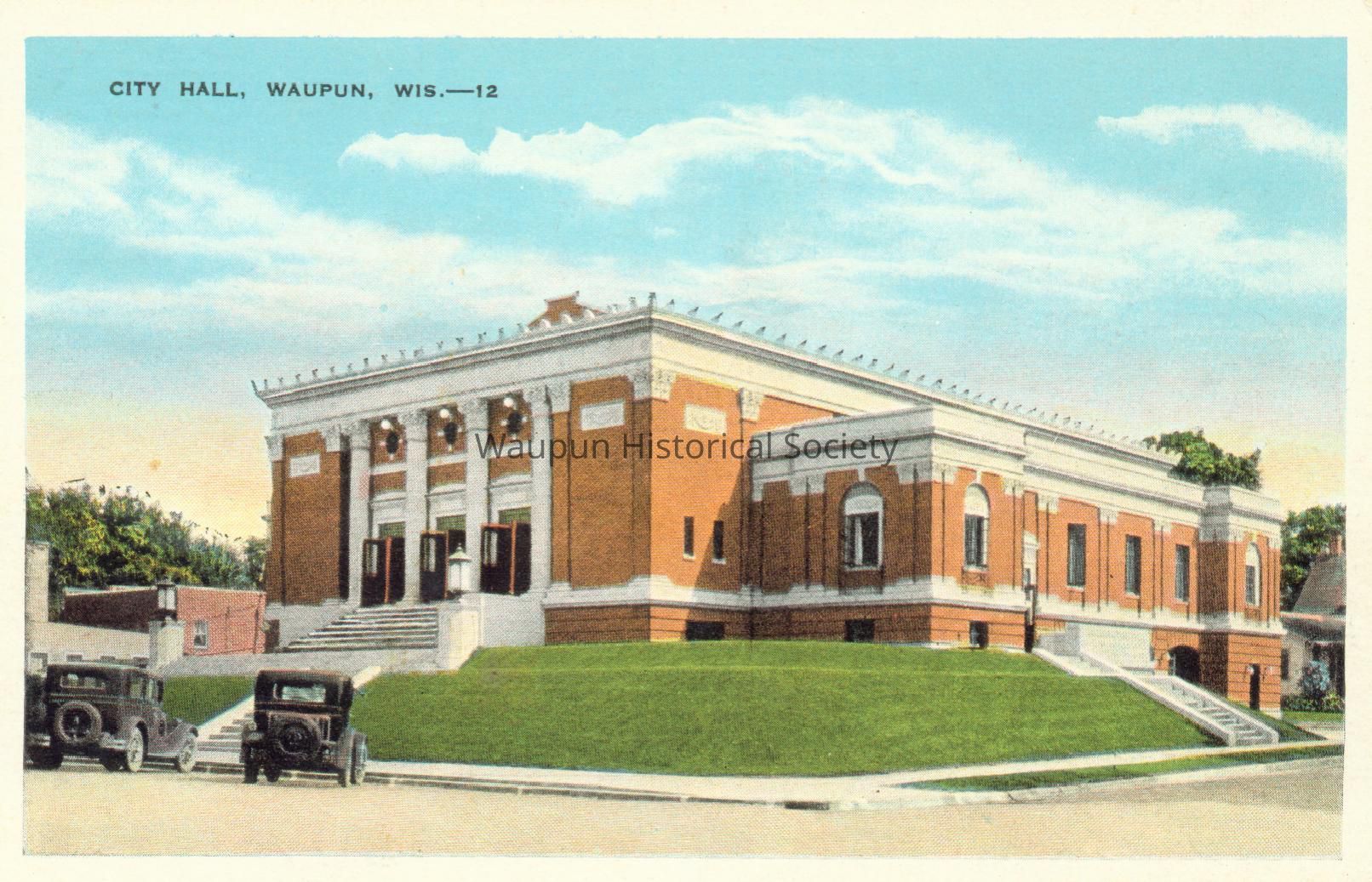 Postcard, City Hall, Wis-12, #1367 N. There are numerious historical files about the City Hall and Auditorium. The building was built on the site of the Union Church (of Union-Congregational Church) and was completed in 1928. At that time it not only contained the City Offices and the Auditorium, but also contained the fire department. In 1985 the planning was started for the construction of the Safety Building. With the completetion of the Safety Building the fire department left the building and the city offices were moved downstairs. There is a more complete history in the 1989 Waupun History.