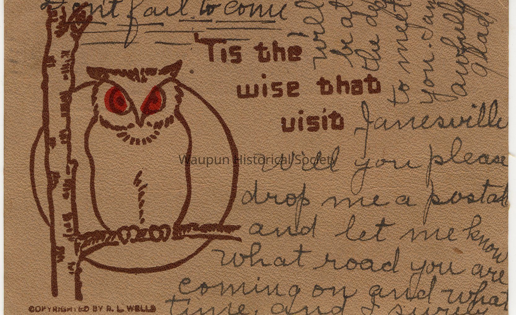 Postcard Collection: This picture postcard has been taken from the scrapbook collection of Miss Doris Doty, donated to the Waupun Heritage Museum by Judith Gatzke. As of this writing, it appears that most of the postcards were posted between 1906 & 1910.Acquisition