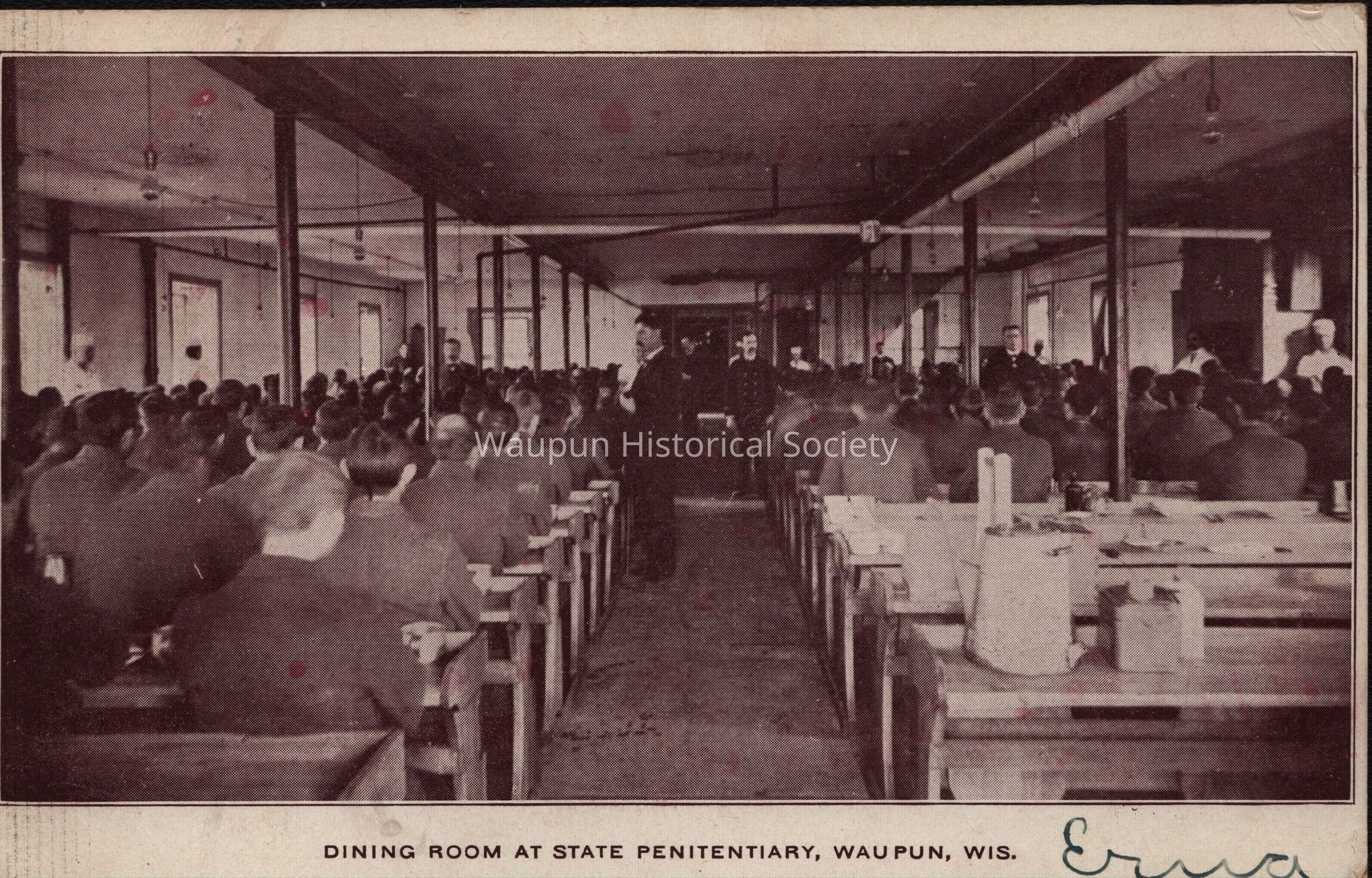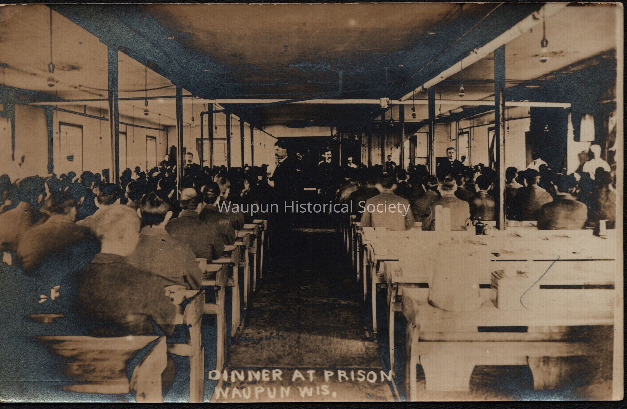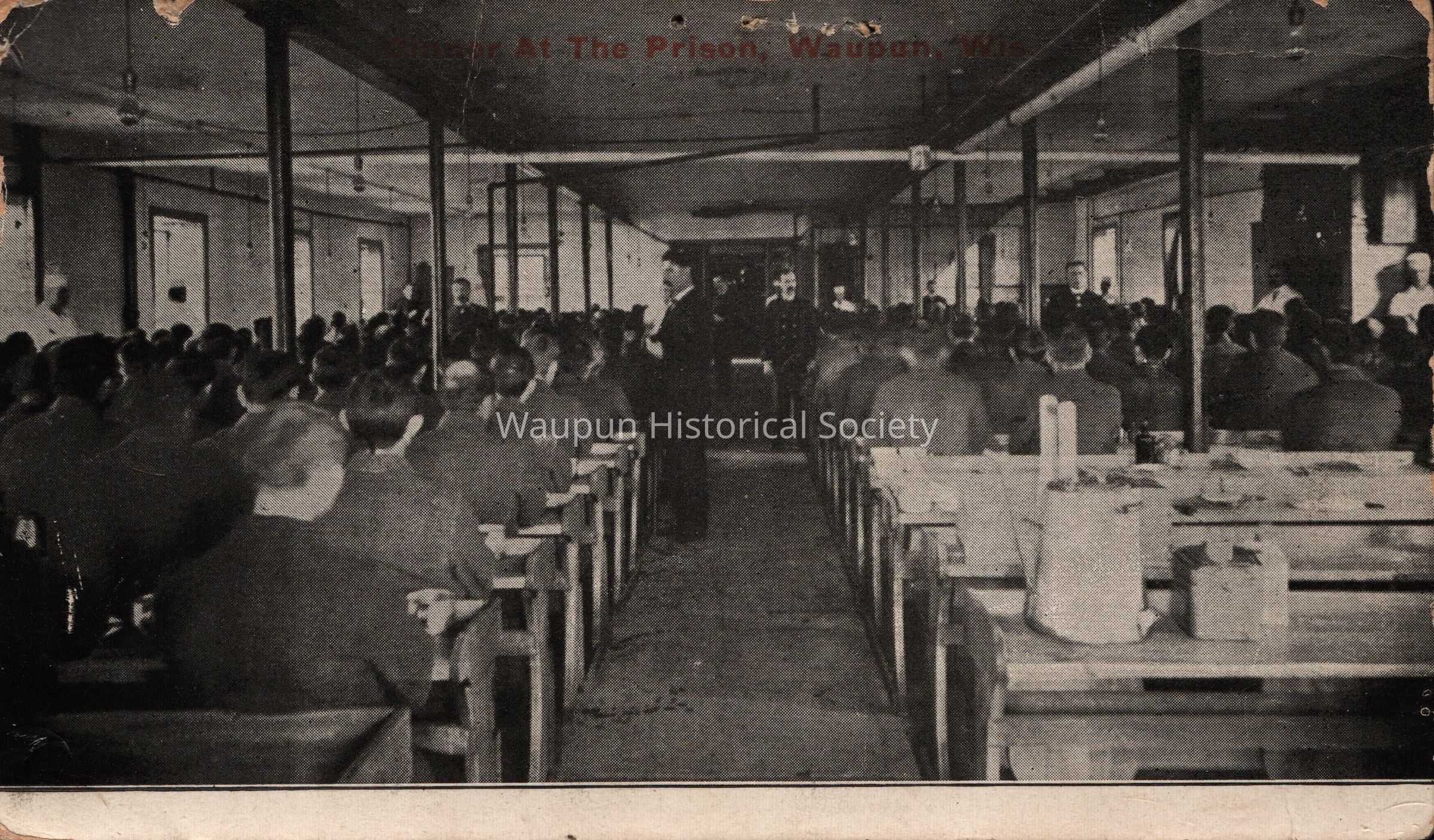 Postcard, Corrections, Wisconsin State Prison, Dining Room at State Penitentiary. A collection of souvenir postcards, circa 1910 featuring the Waupun State Prison. Unless otherwise noted, these postcards were taken by Stanley Johnson a local photographer at the time.