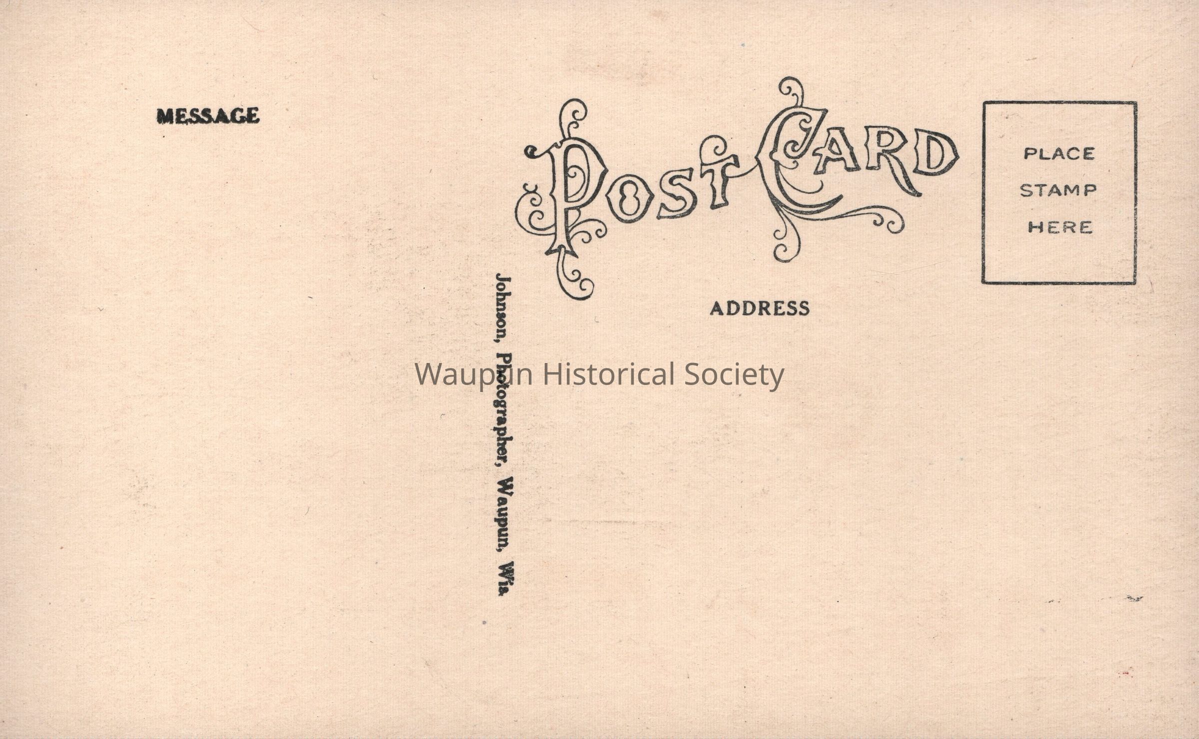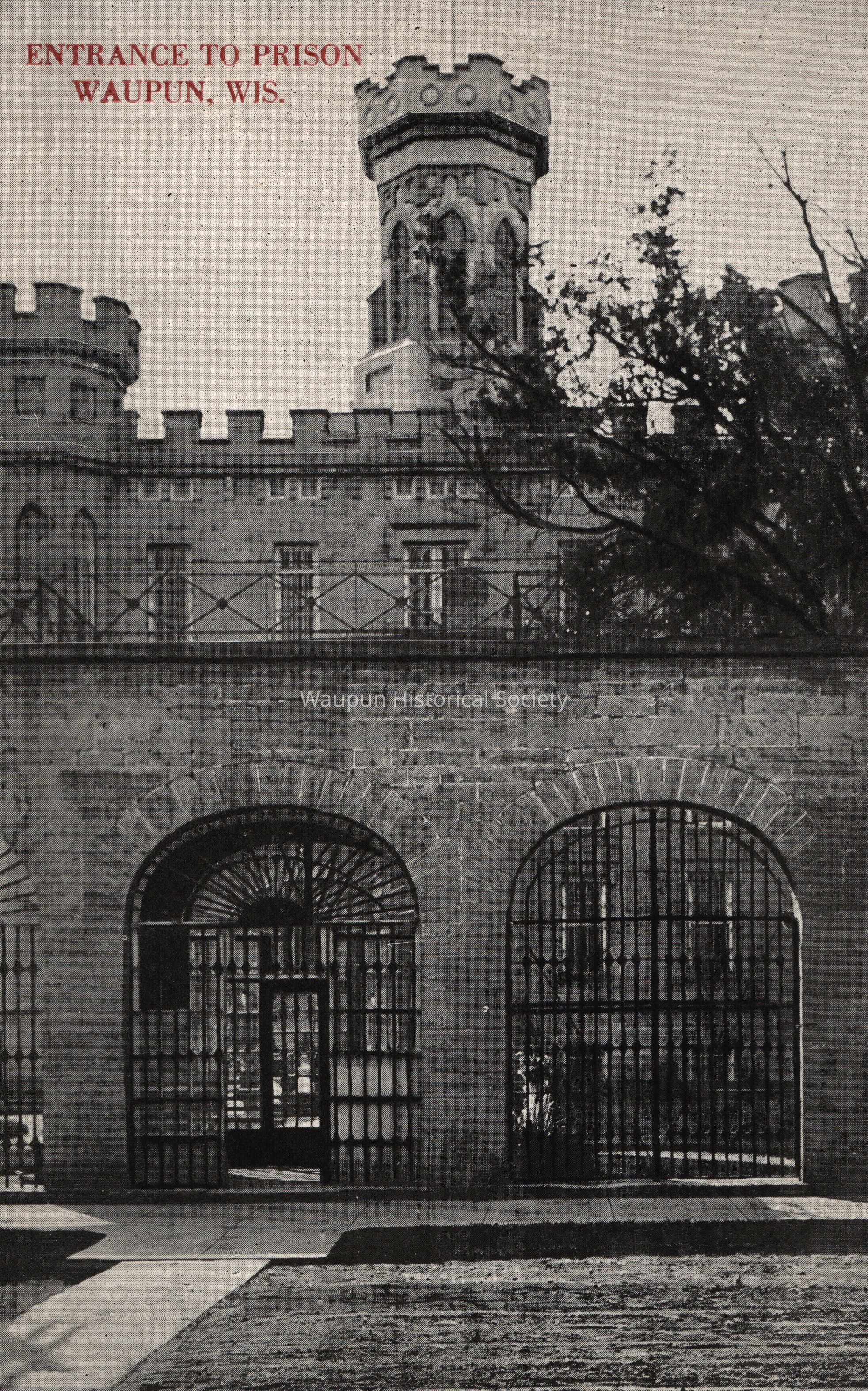 Postcard, Corrections, Wisconsin State Prison, Entrance to Prison. A collection of souvenir postcards, circa 1910 featuring the Waupun State Prison. Unless otherwise noted, these postcards were taken by Stanley Johnson a local photographer at the time. Notice that the tower on the main building is painted with multiple colors of paint.
