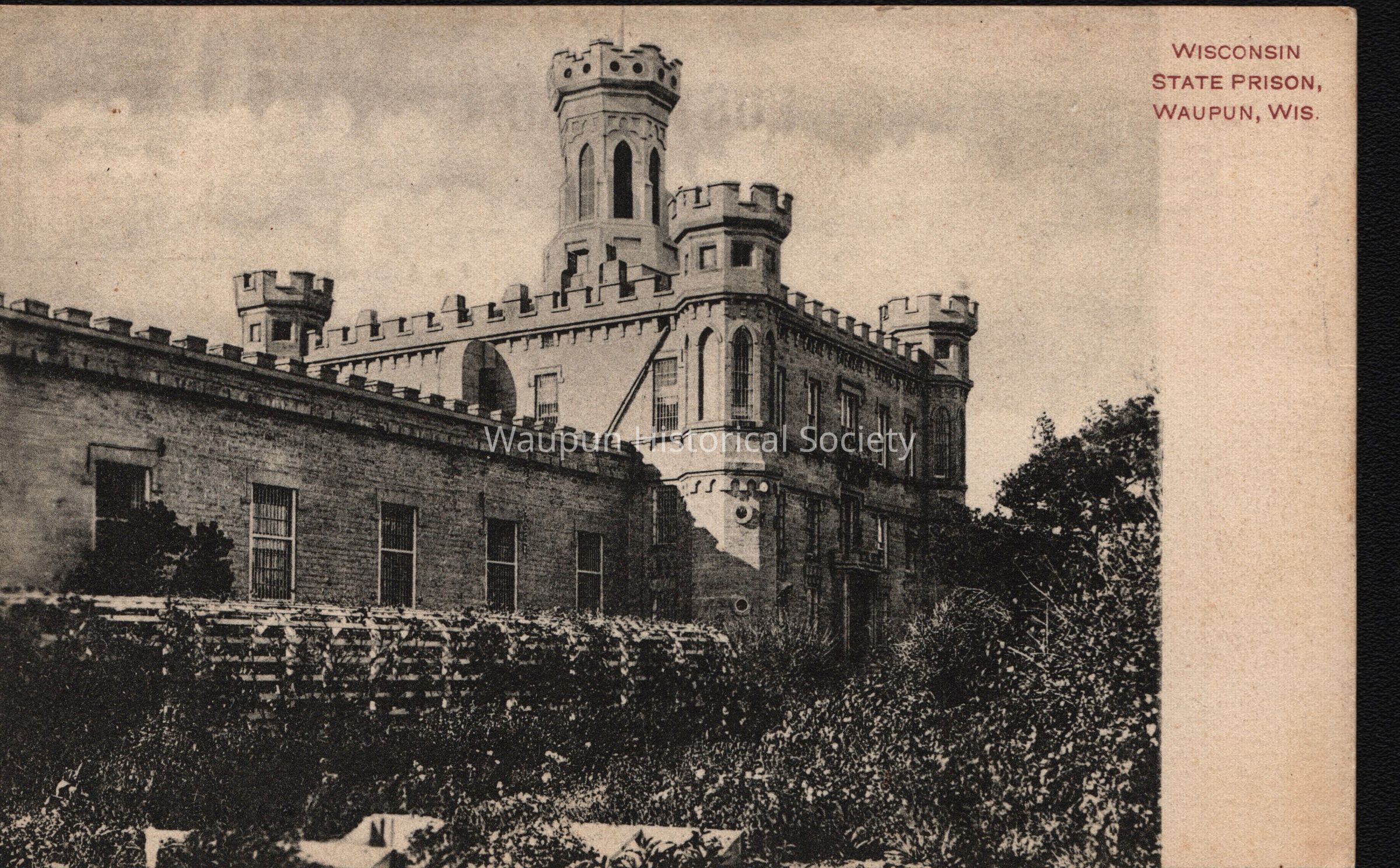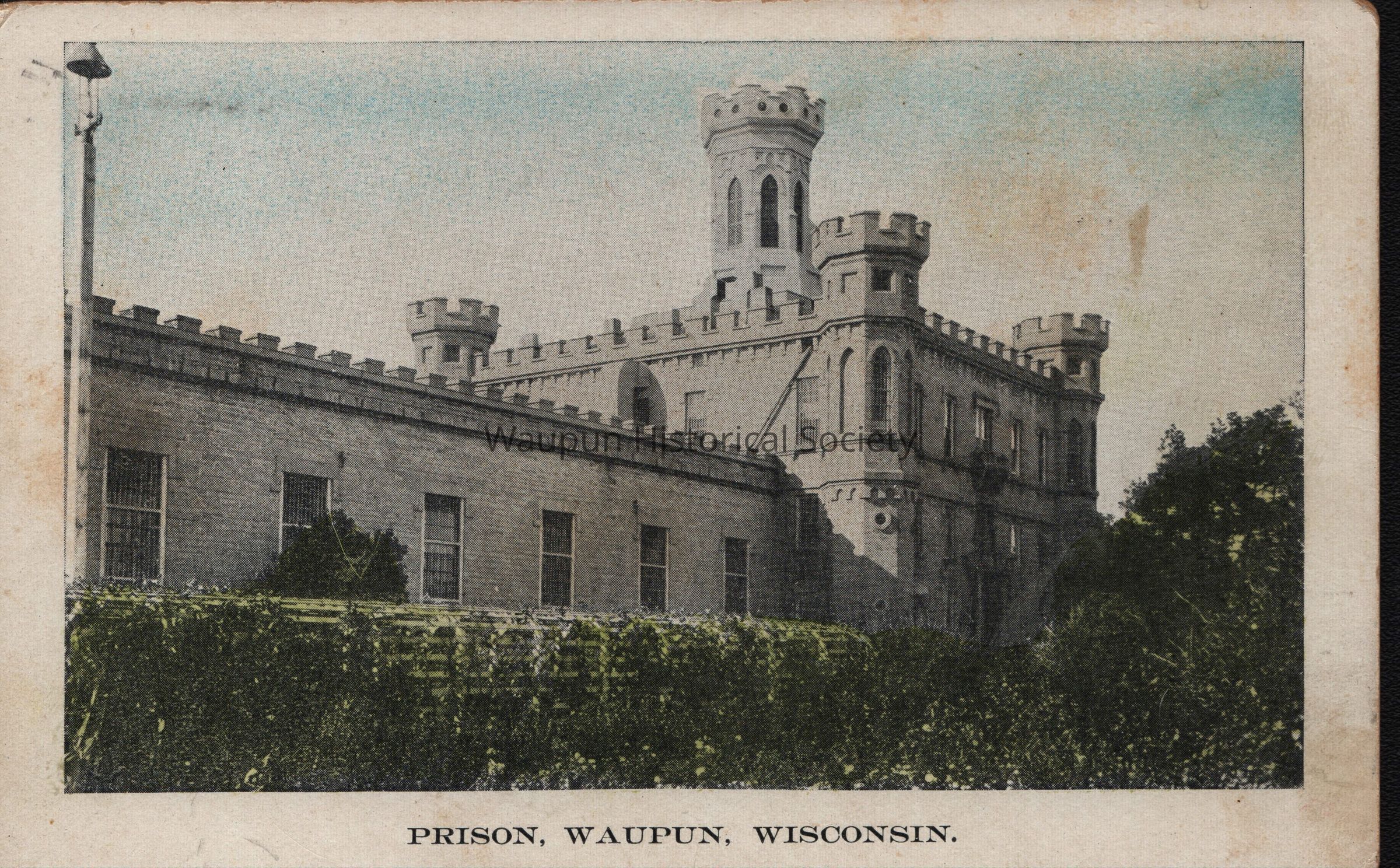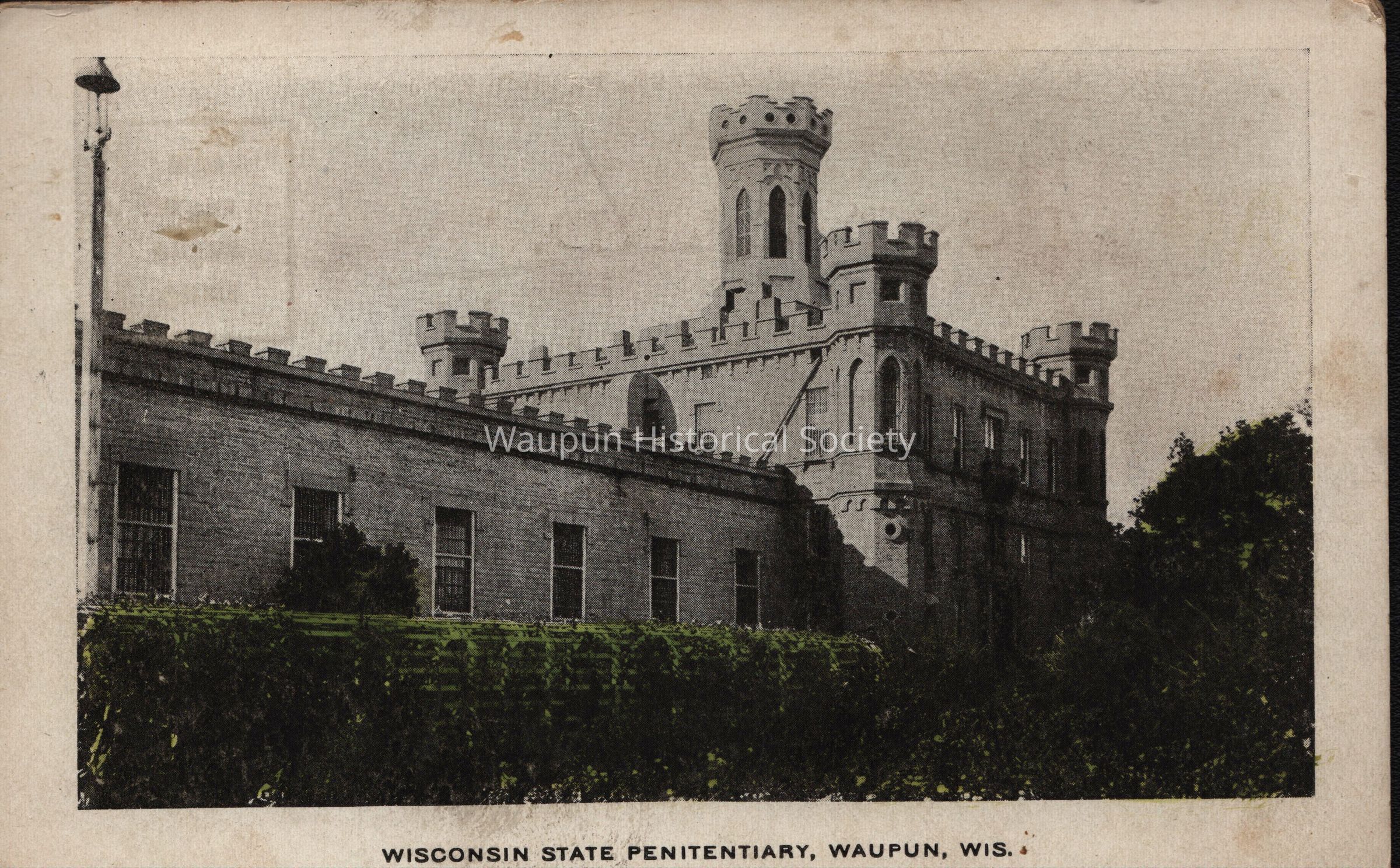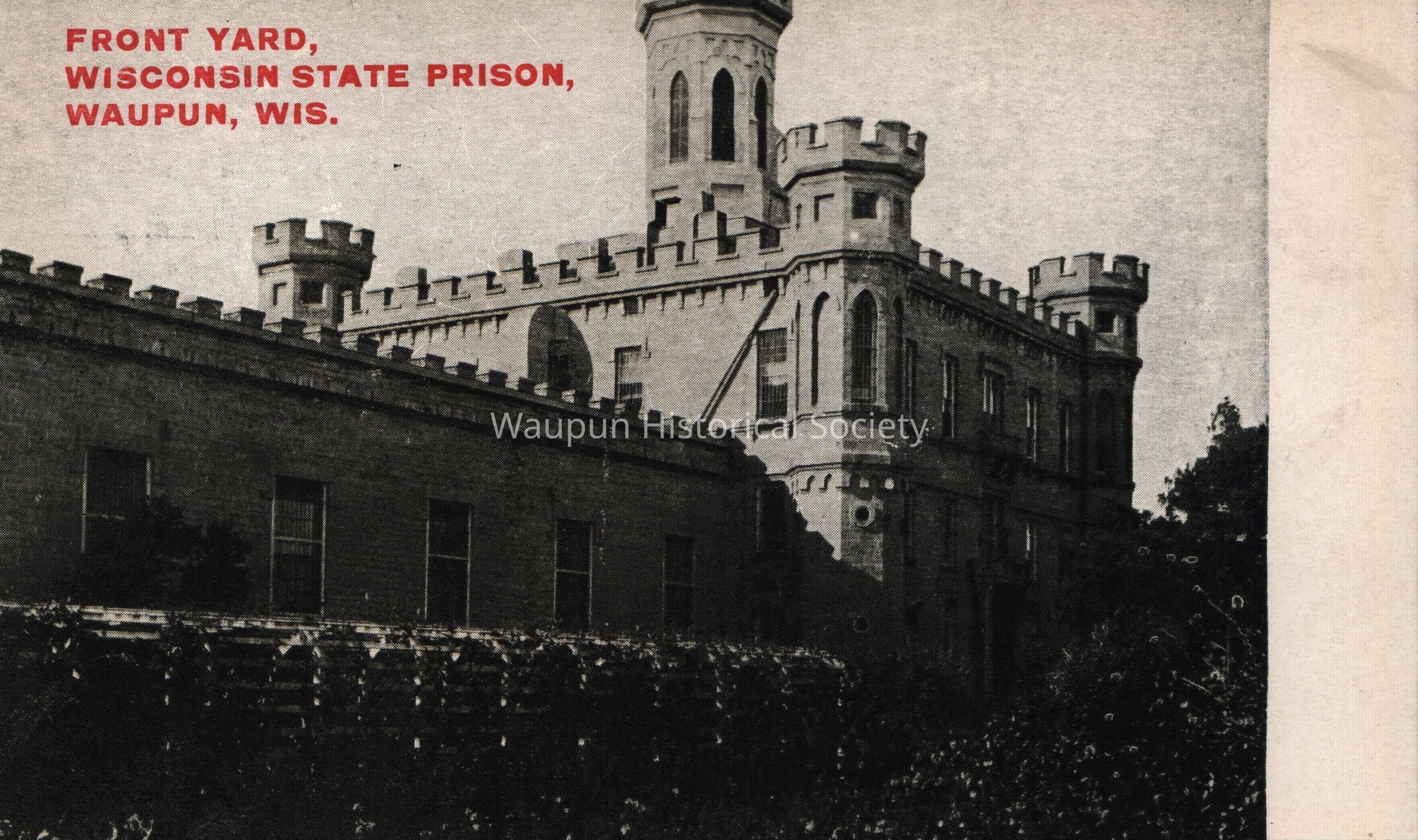 On the front of the postcard printed in red, it says; "Front Yard, Wisconsin State Prison, Waupun, Wis."Acquisition
