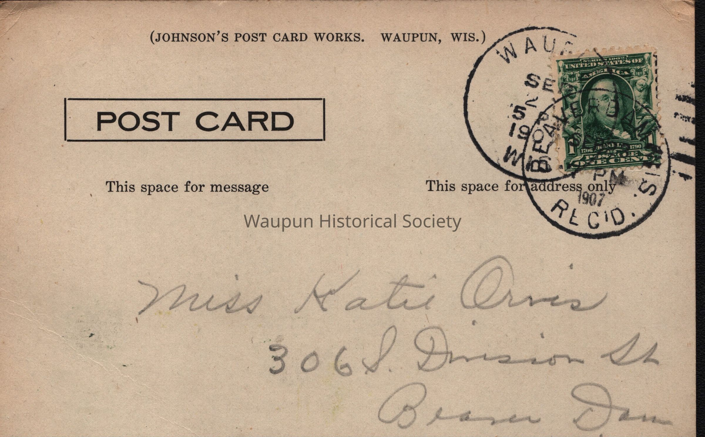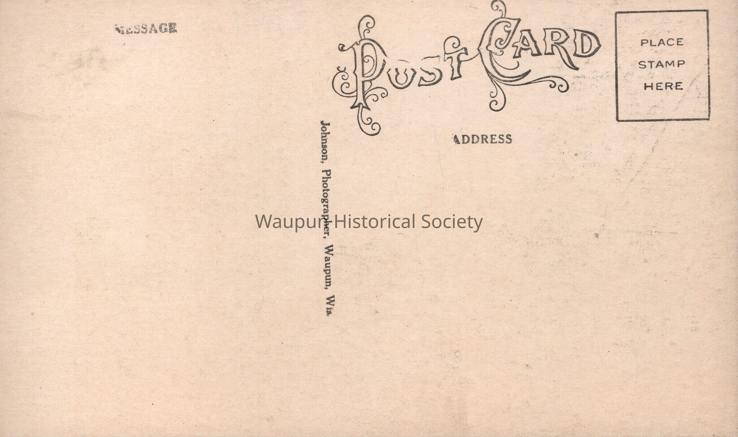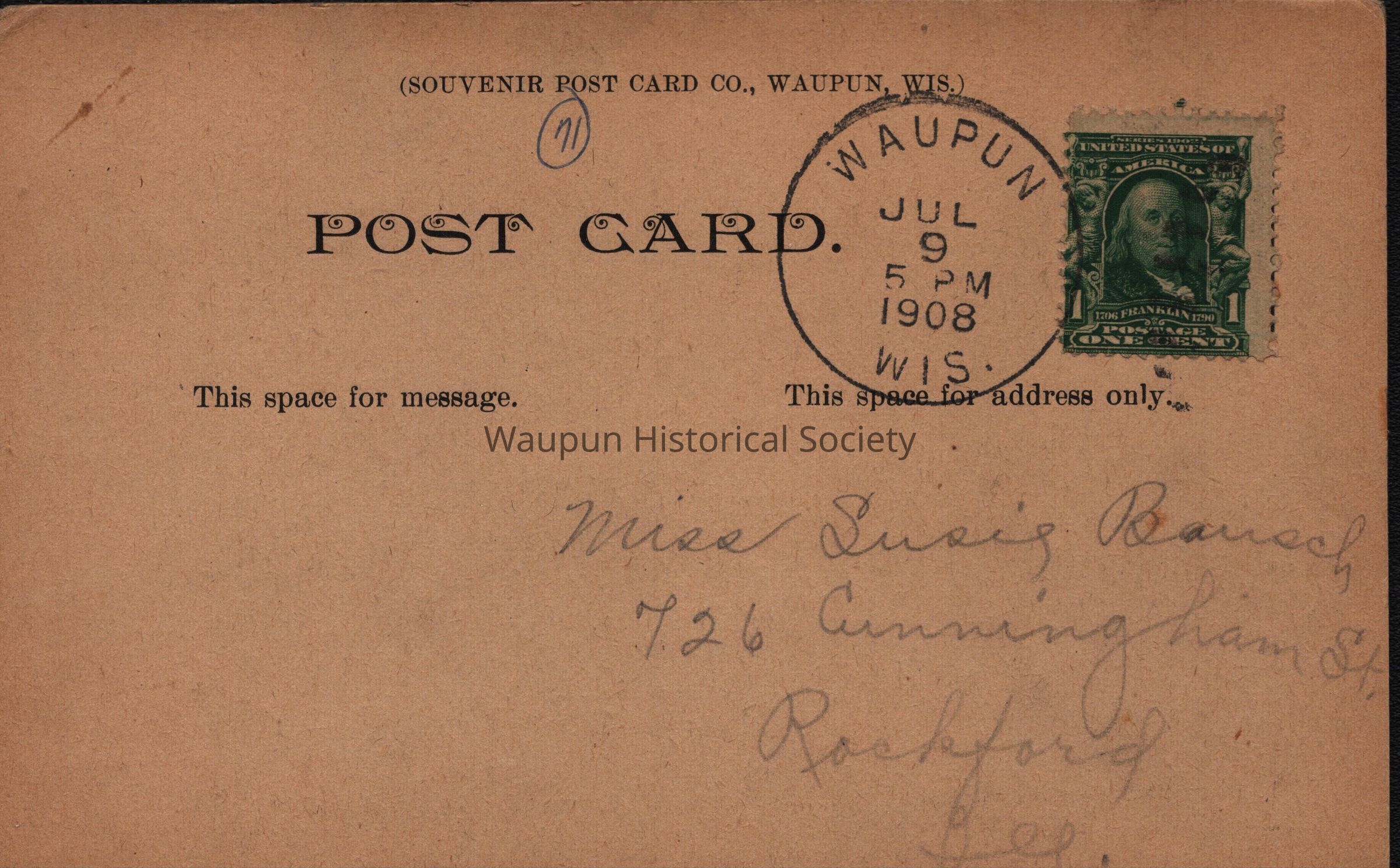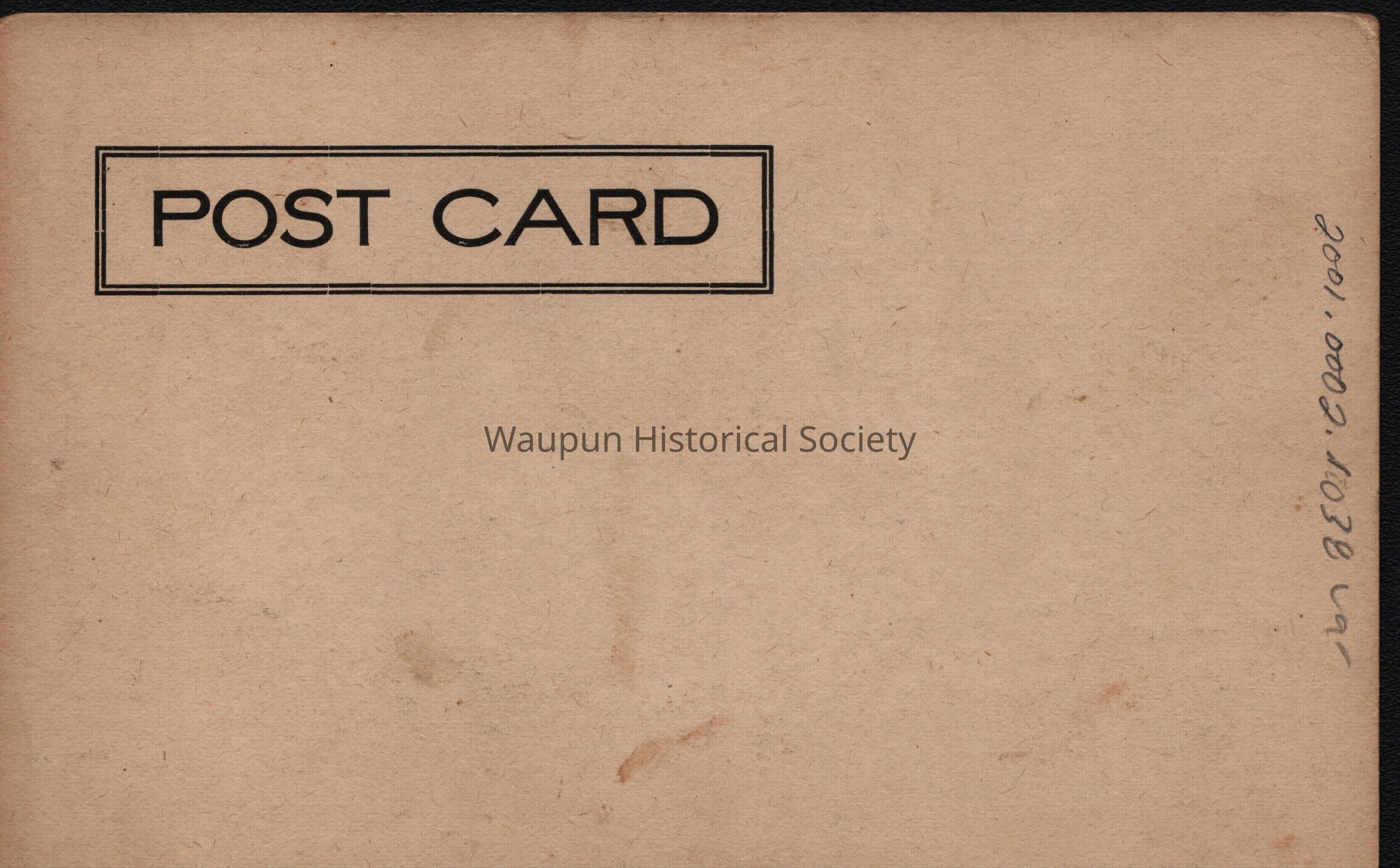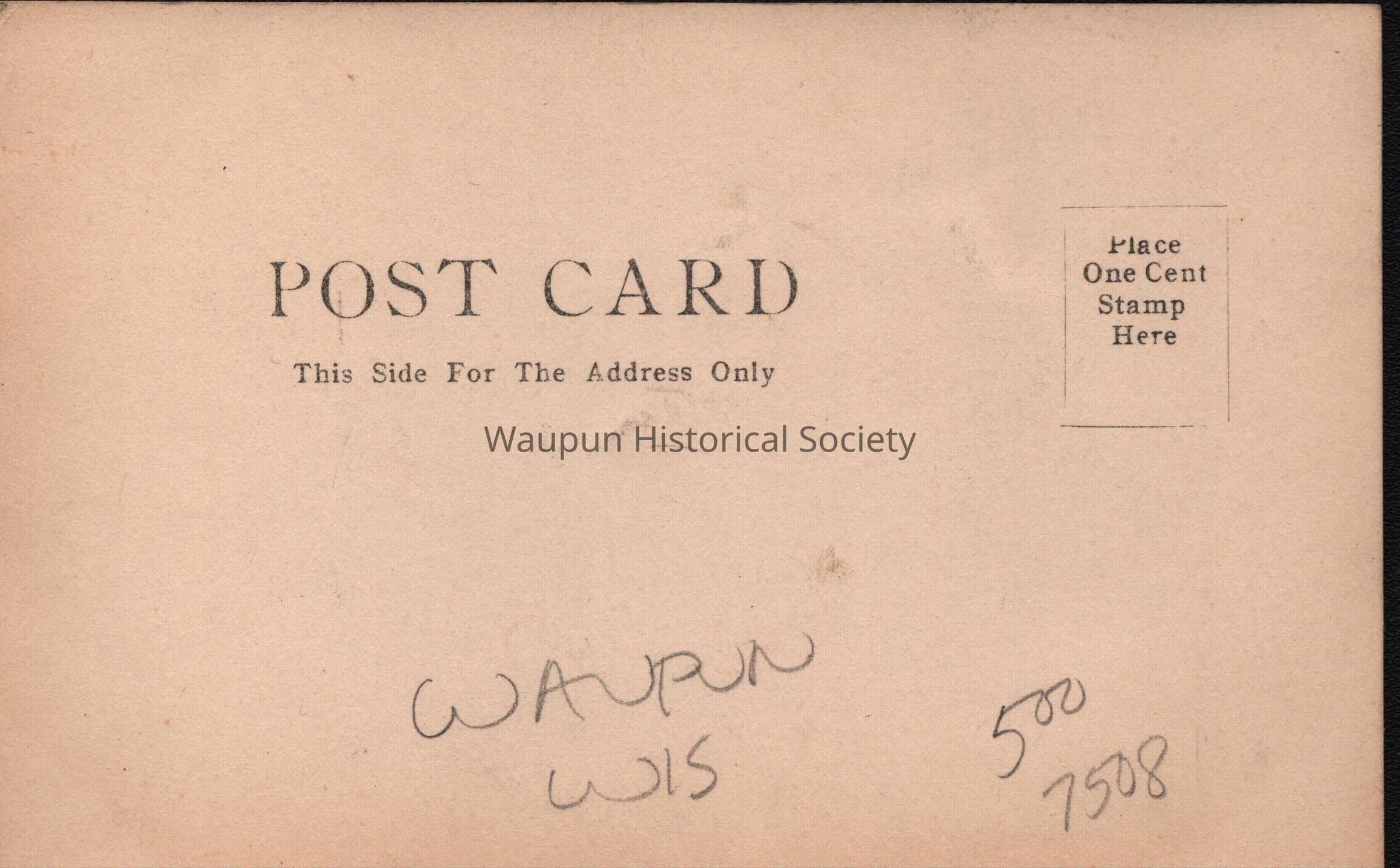 On the front of the postcard printed in red, it says; "Front Yard, Wisconsin State Prison, Waupun, Wis."Acquisition