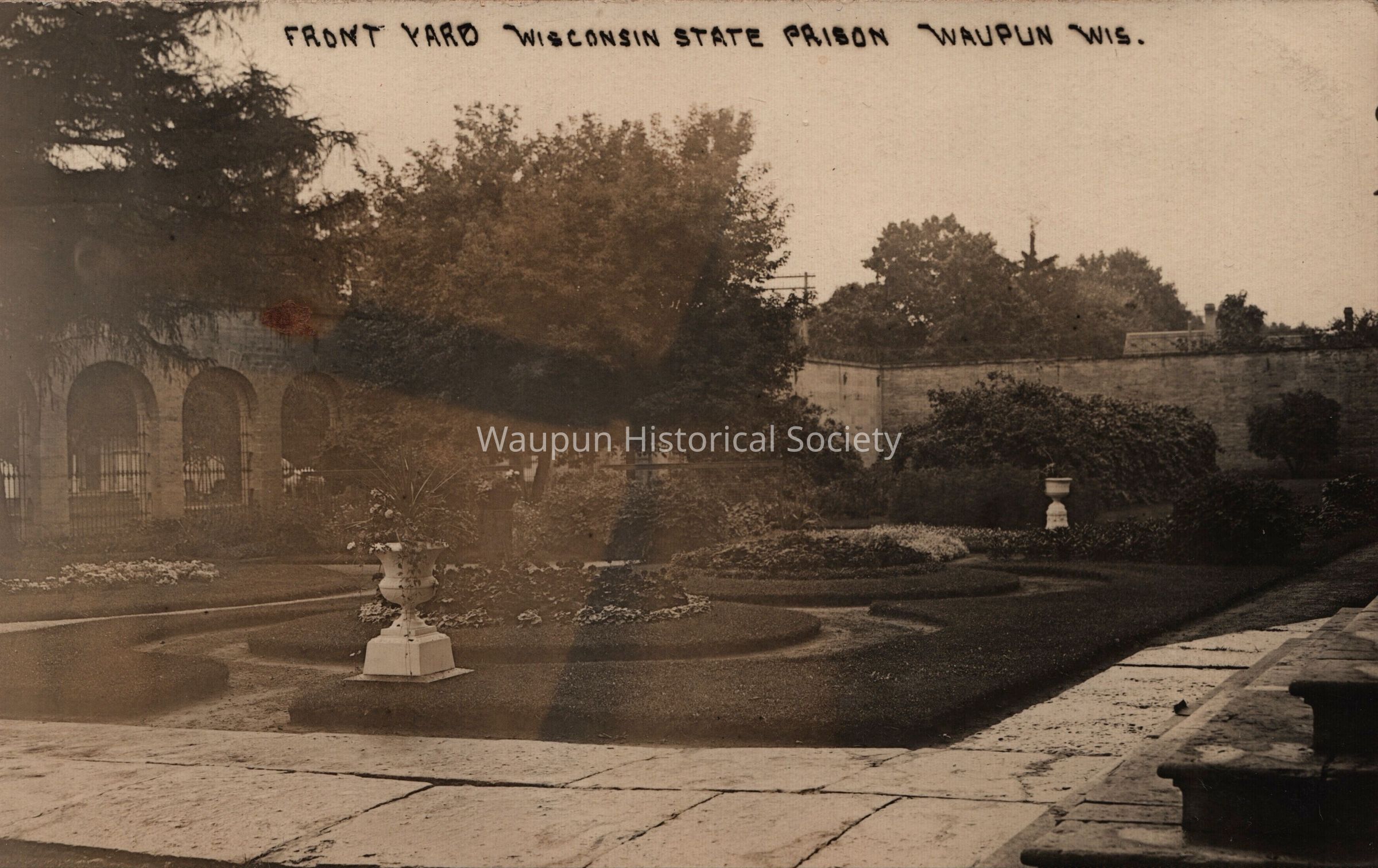 Postcard, Corrections, Wisconsin State Prison, Front Yard. A collection of souvenir postcards, circa 1910 featuring the Waupun State Prison. Unless otherwise noted, these postcards were taken by Stanley Johnson a local photographer at the time.Acquisition