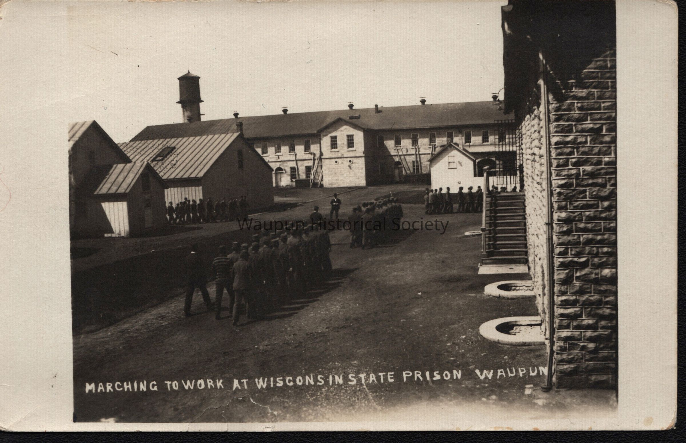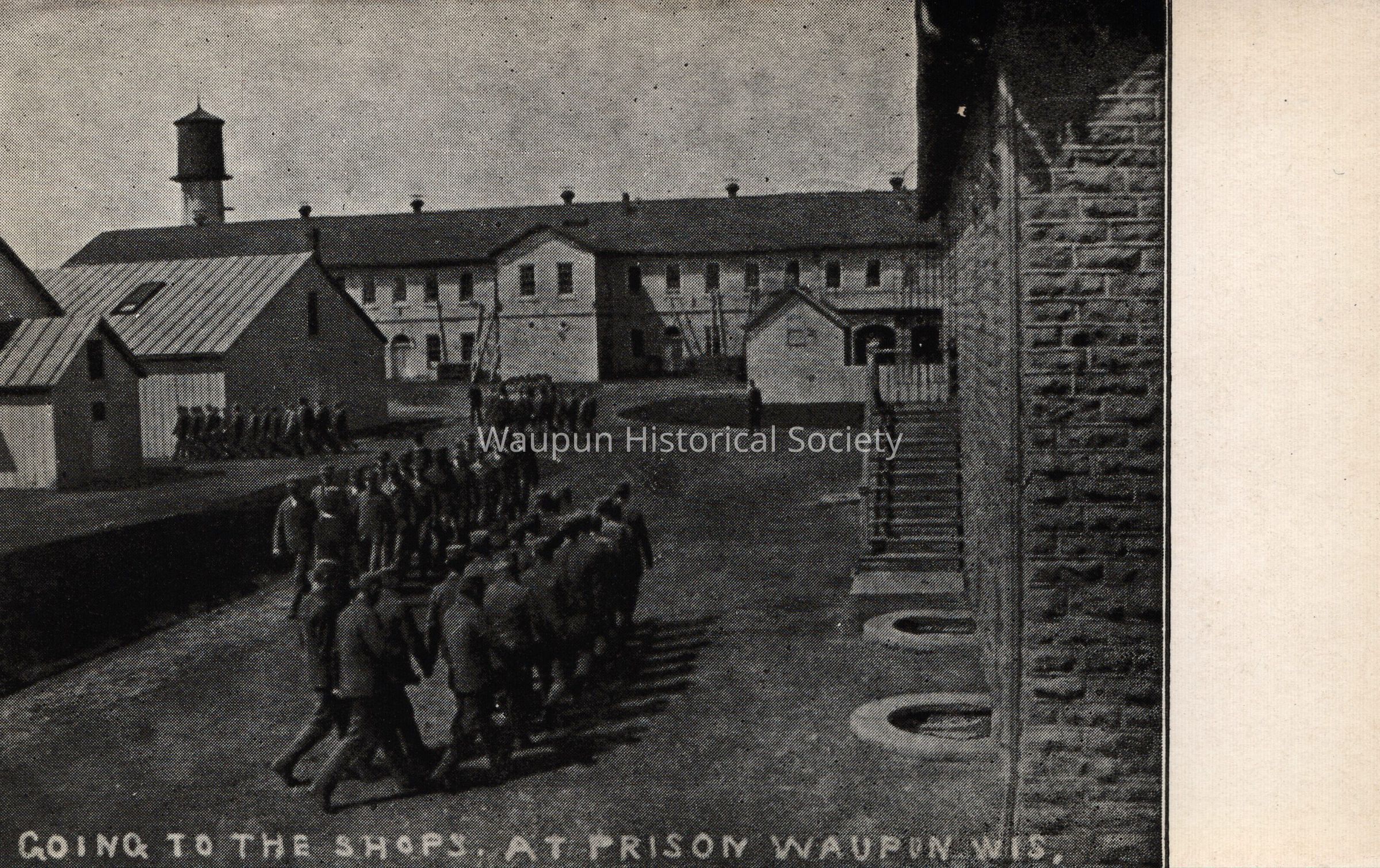 Postcard, Corrections, Wisconsin State Prison, Going to the Shops. A collection of souvenir postcards, circa 1910 featuring the Waupun State Prison. Unless otherwise noted, these postcards were taken by Stanley Johnson a local photographer at the time.
