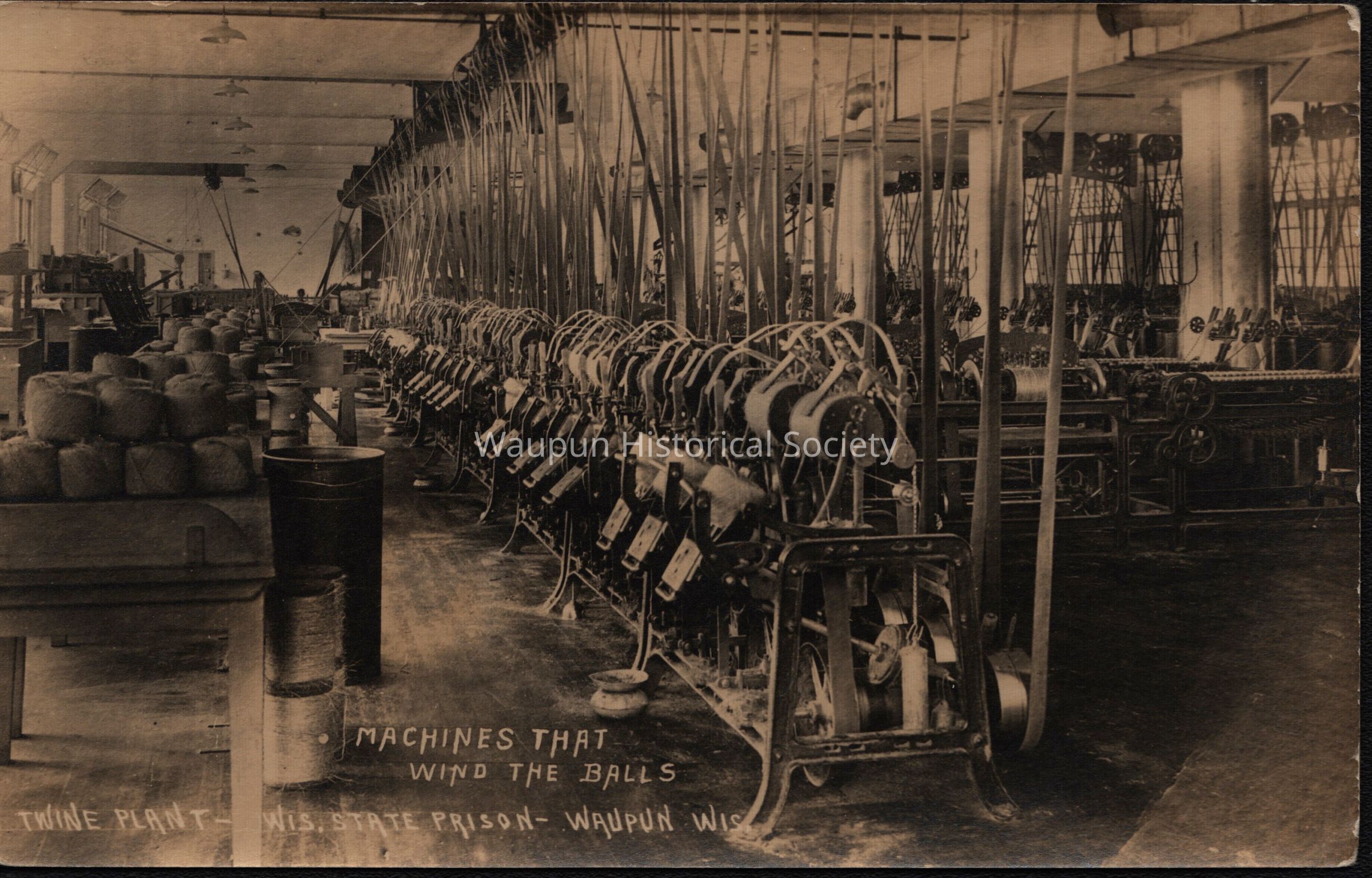 Postcard, Corrections, Wisconsin State Prison, Machines that Wind the Balls, Twine Plant. A collection of souvenir postcards, circa 1910 featuring the Waupun State Prison. Unless otherwise noted, these postcards were taken by Stanley Johnson a local photographer at the time.