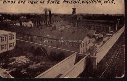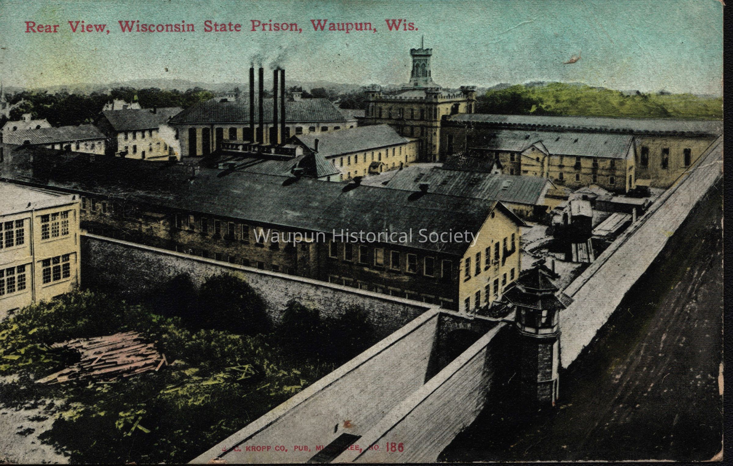 Postcard, Corrections, Wisconsin State Prison, Rear View, #186. A collection of souvenir postcards, circa 1930 featuring the Waupun State Prison. This postcard was printed by the E.C. Kropp Co. of Milwaukee. The photos are "courtesy of the Milwaukee Journal."Acquisition