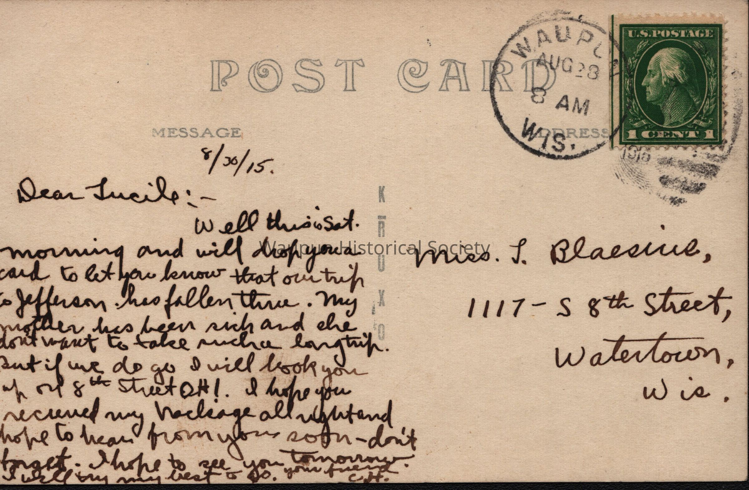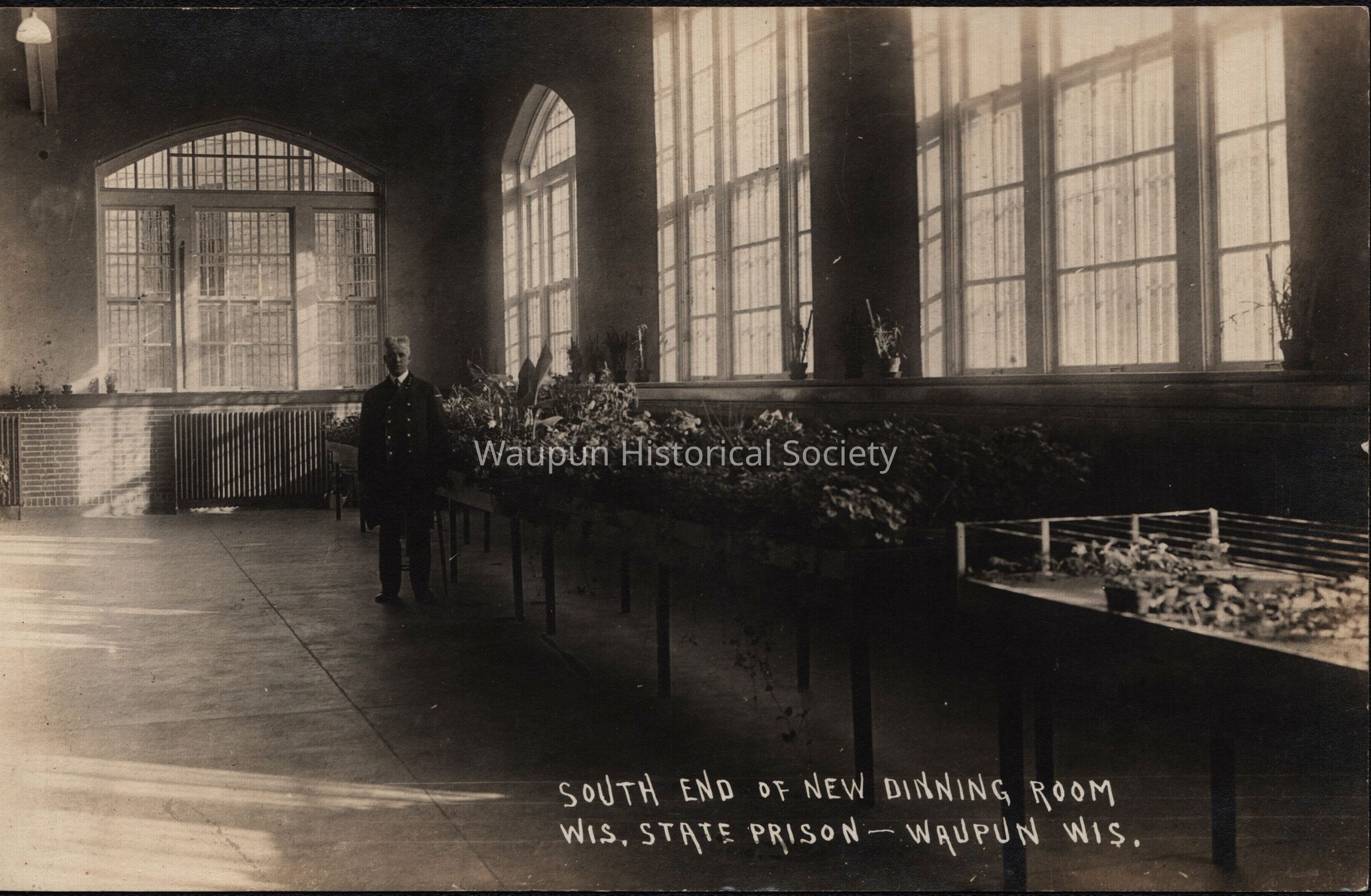 Postcard, Corrections, Wisconsin State Prison, South End of New Dining Room. A collection of souvenir postcards, circa 1910 featuring the Waupun State Prison. Unless otherwise noted, these postcards were taken by Stanley Johnson a local photographer at the time.Acquisition