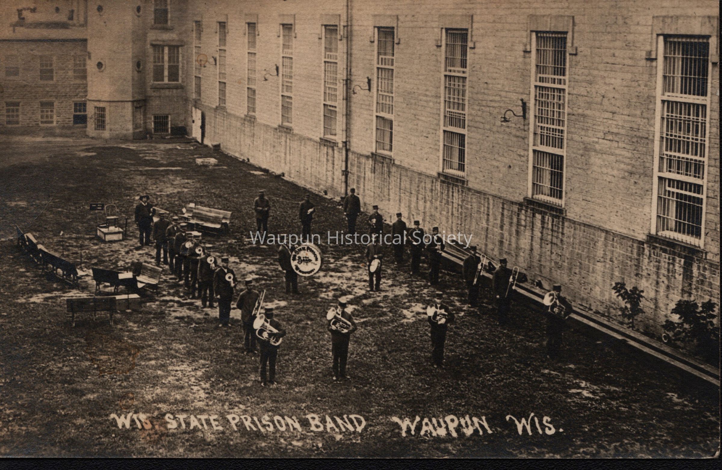 Postcard, Corrections, Wisconsin State Prison, State Prison Band. A collection of souvenir postcards, circa 1910 featuring the Waupun State Prison. Unless otherwise noted, these postcards were taken by Stanley Johnson a local photographer at the time.