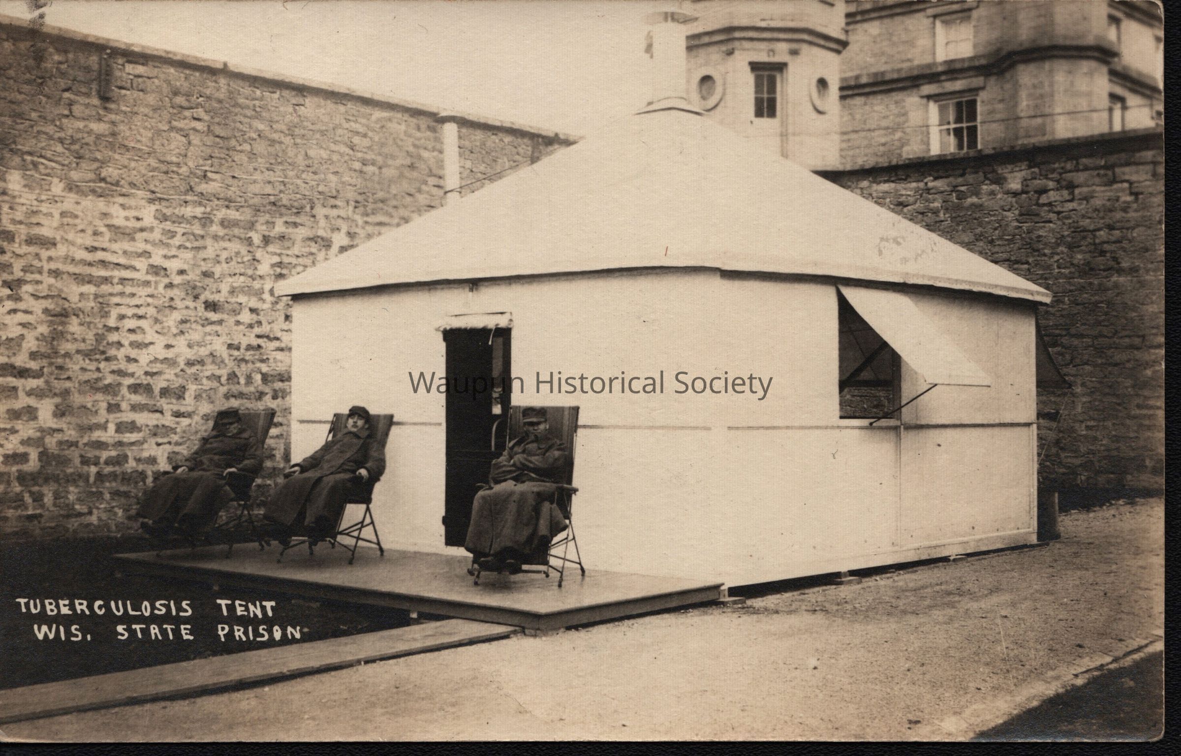 Postcard, Corrections, Wisconsin State Prison, Tuberculosis Tent. A collection of souvenir postcards, circa 1910 featuring the Waupun State Prison. Unless otherwise noted, these postcards were taken by Stanley Johnson a local photographer at the time.