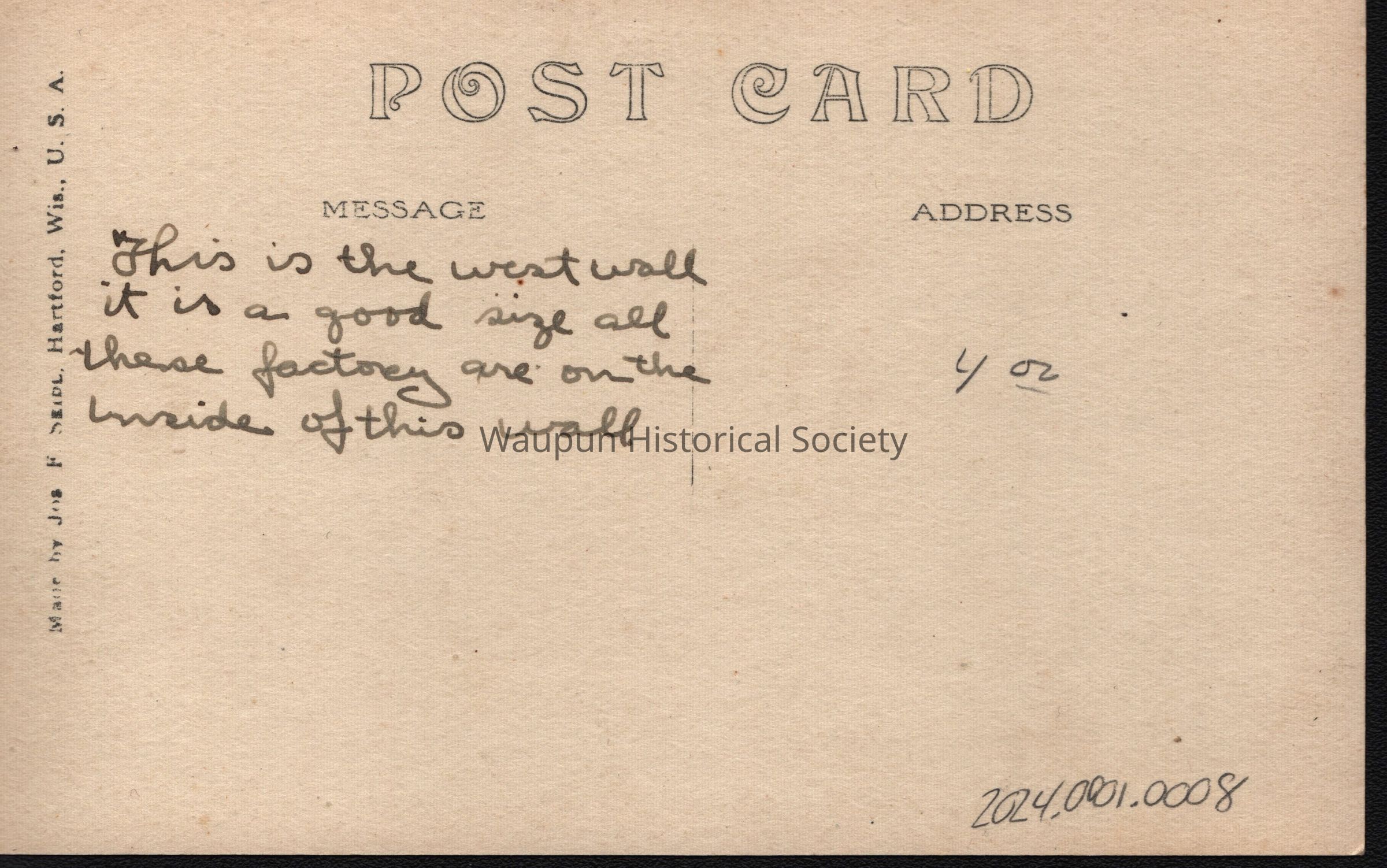 Postcard, Corrections, Wisconsin State Prison, West WallAcquisition