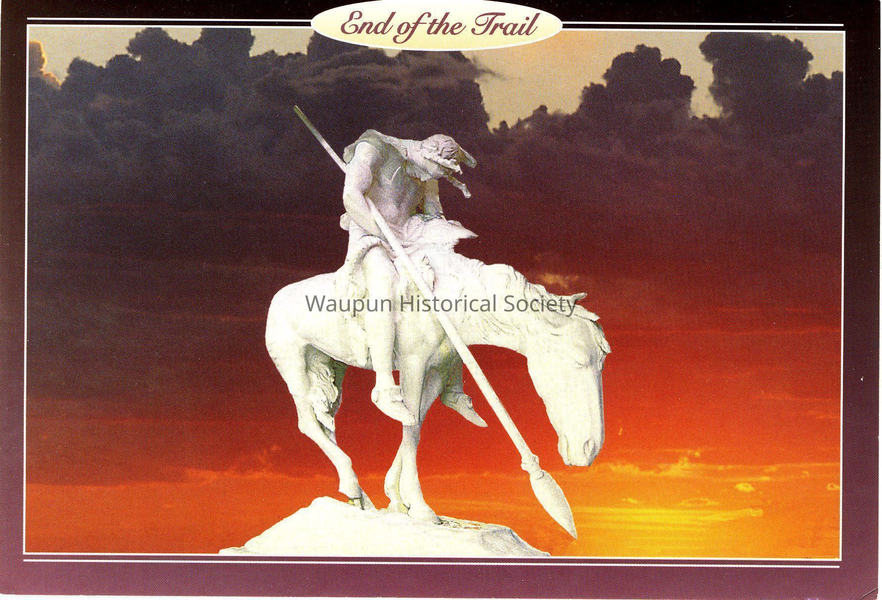 End of the Trail postcard. Refers to the End of the Trail at the Cowboy Hall of Fame in Oklahoma City, Oklahoma. On the back of the postcard is written: [End of the Trail, Oklahoma, For thousands of Native Americans who were displaced from their original homeland, Oklahoma became their "End of the Trail." (Sculpture by James Earle Fraser, National Cowboy Hall of Fame, Oklahoma City, Oklahoma.)]