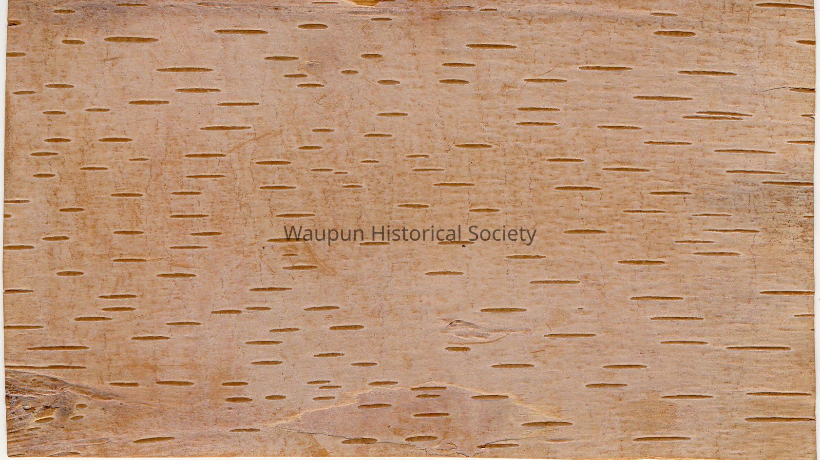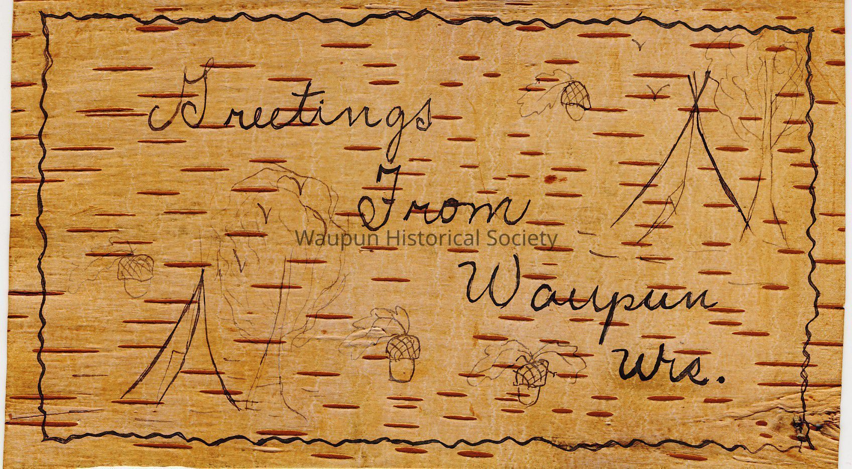 1 postcard from Judy Cole. The postcard is made from bark and indicates: "Greetings From Waupun, Wis." It also has some pictures of tepees on the front, nothing on the back.Acquisition