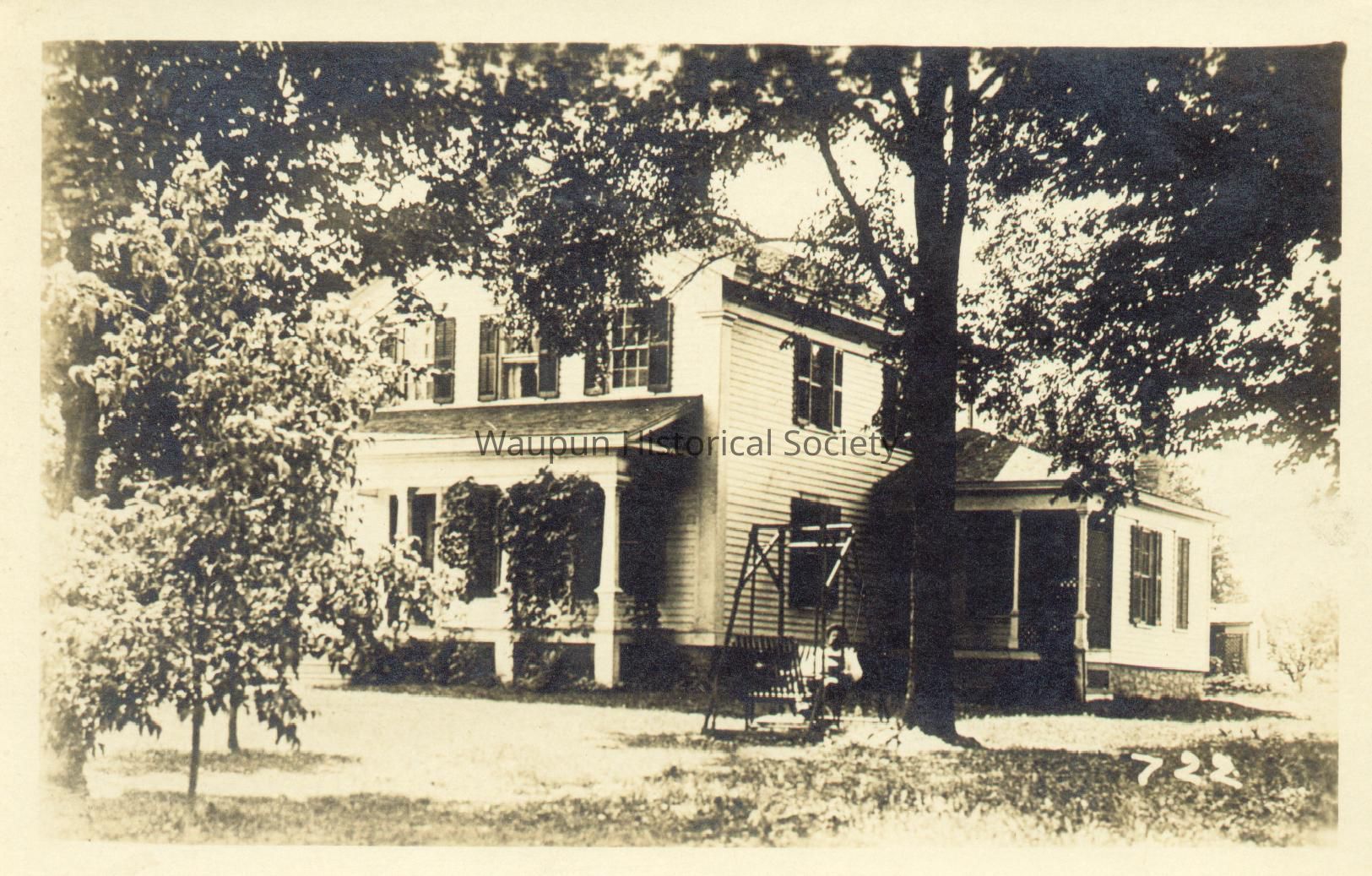 Postcard, Houses, 529 East Lincoln Street, #722. This is a postcard picture of the home at 529 E Lincoln. At various times it was owned by the Robinsons, H. M. Larson, D. J. Hutchinson, Dr. Miller, Disbrow, and Parish.