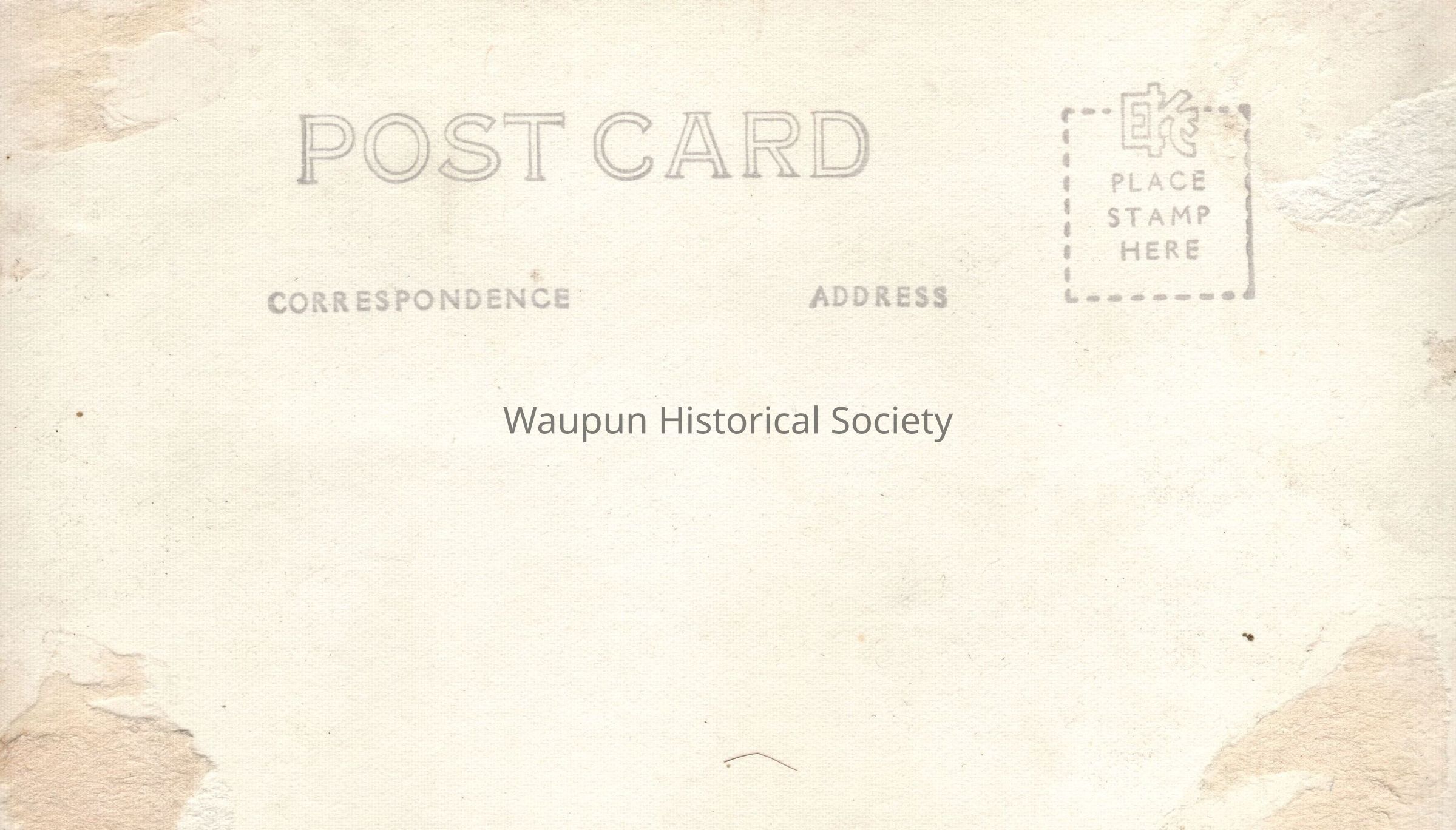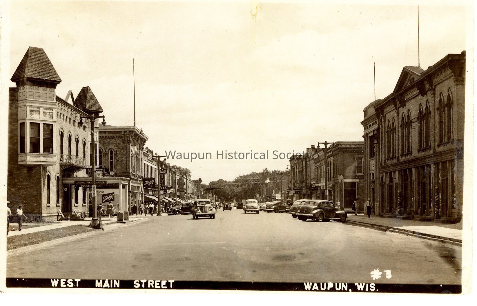 Postcard, Main Street Waupun, Looking East, circa 1940. Two postcards are attached. They are the same, but the first is shifted to the right, the second , shifted to the leftAcquisition