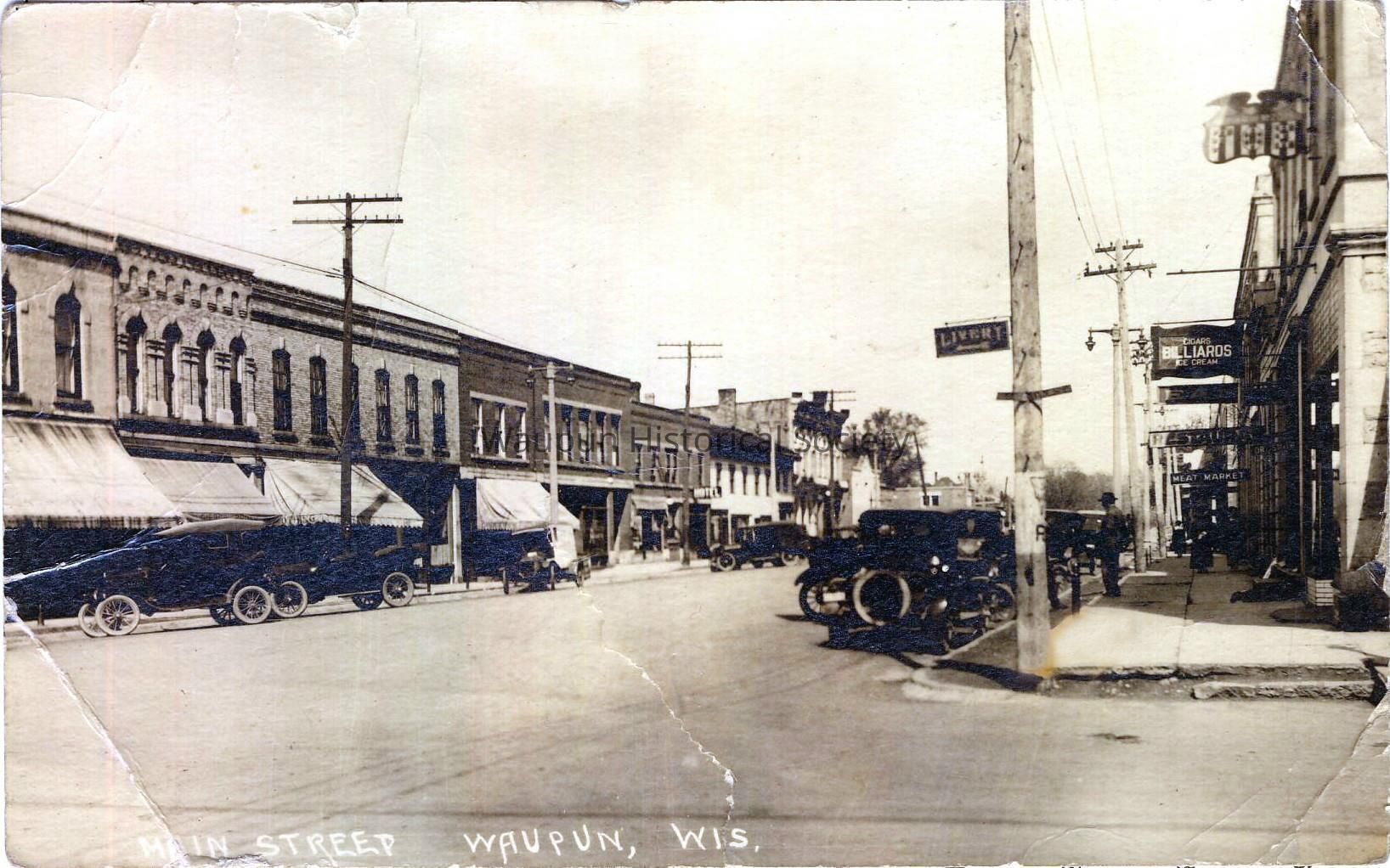 The sign on the Telephone pole reads: "Livery." The store signs read (closest to farthest) Billiards, Eats, Restaurant, Meat MarketAcquisition