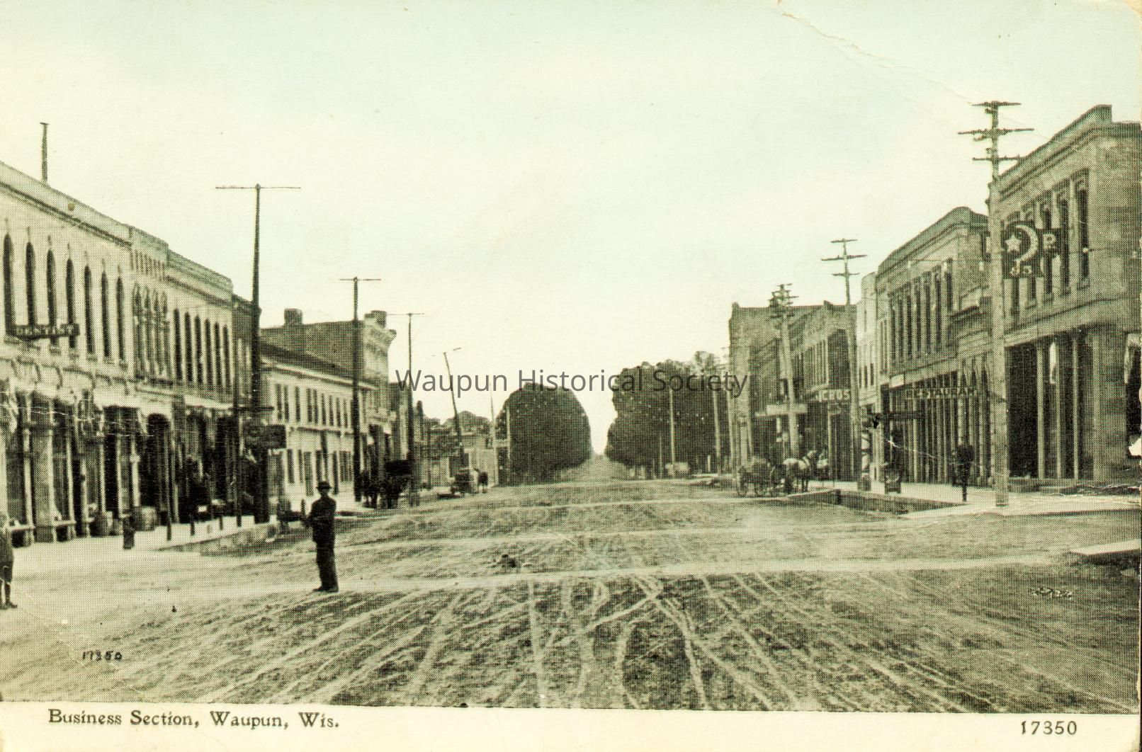 Postcard, Main Street Waupun, Looking East. Shows old hotel that was torn down the night of Jud's fire. Notice the lodge sign on the right.Acquisition