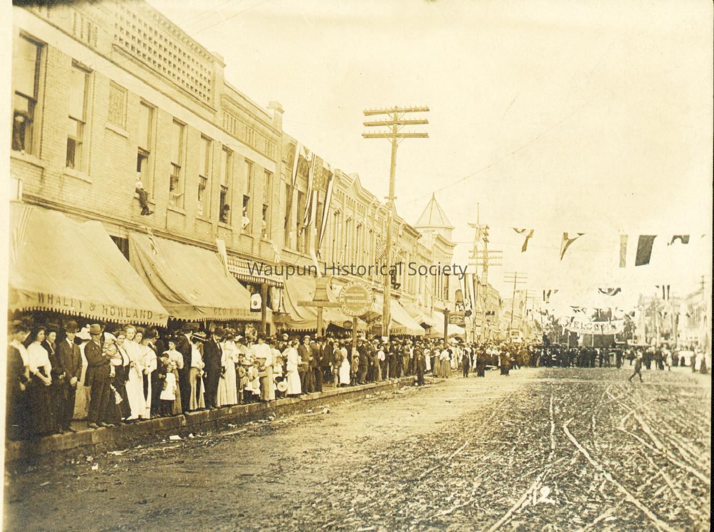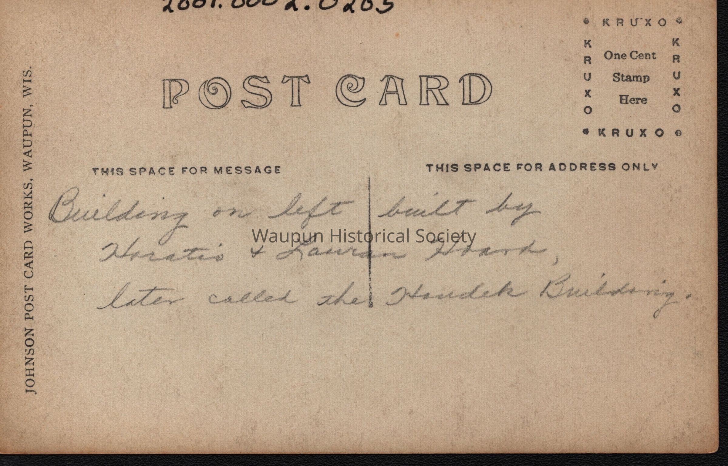 Postcard, Main Street Waupun, Looking East. Back of card indicates "Building on left built by Horatio and Lauran Hoard, later called the Houdek Building."Acquisition