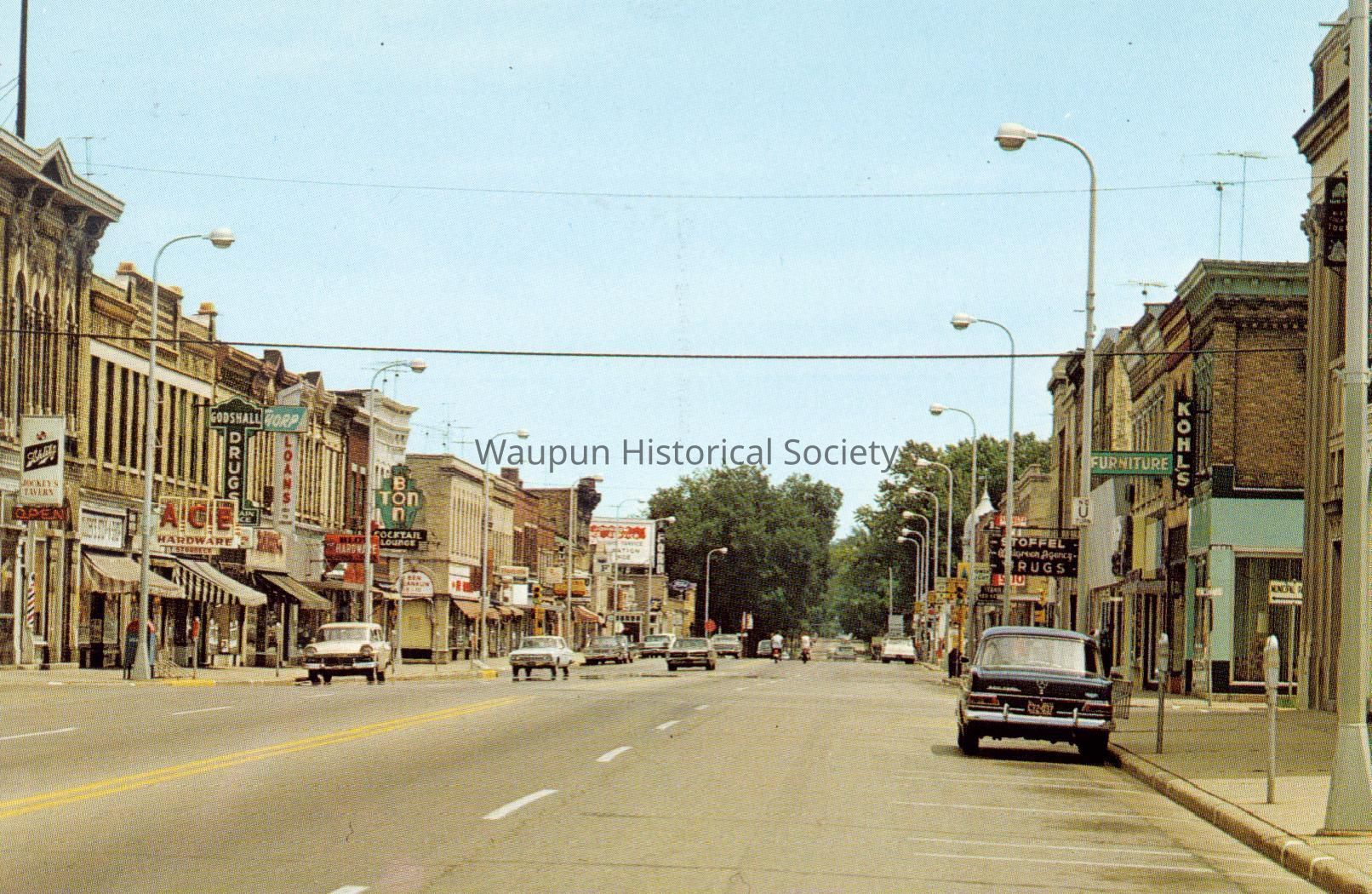 Postcard, Main Street in Waupun looking east. Thought to be in the middle 1960s.