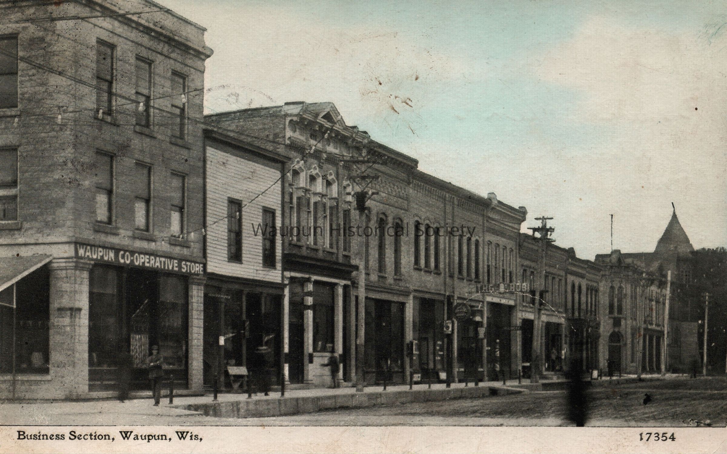 Postcard, Waupun Main Street. circa 1915. Corner of Main & Madison, looking southwest. Steeple of Union Church in right corner. Waupun co-operative store was called the Hoard building in fore-ground. Wood building on the immediate right later burned and was replaced.Acquisition