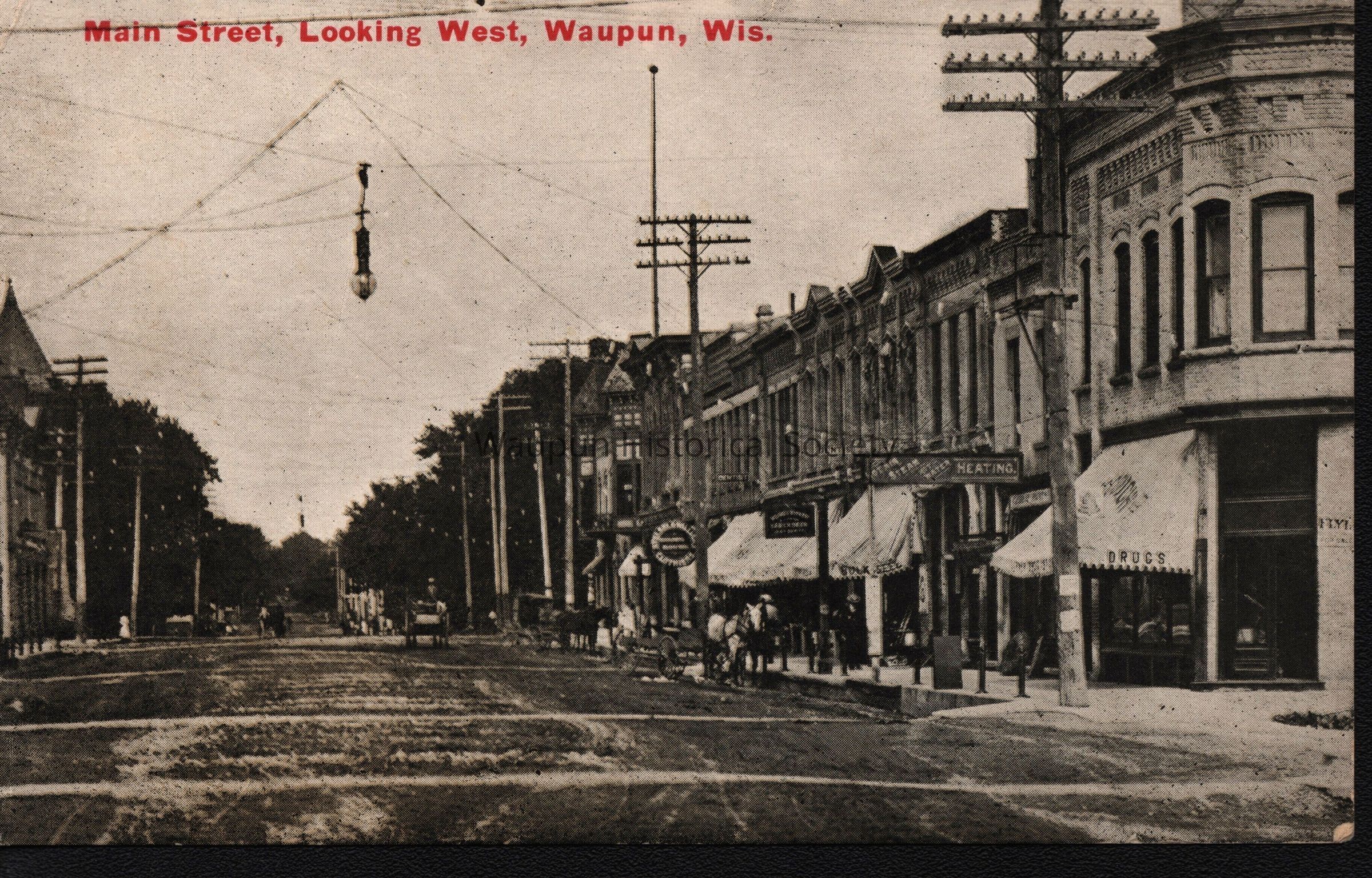 Main Street in Waupun looking west. Union Church is on left and Hotel Waupun is on right. Postmarked 1916.Acquisition