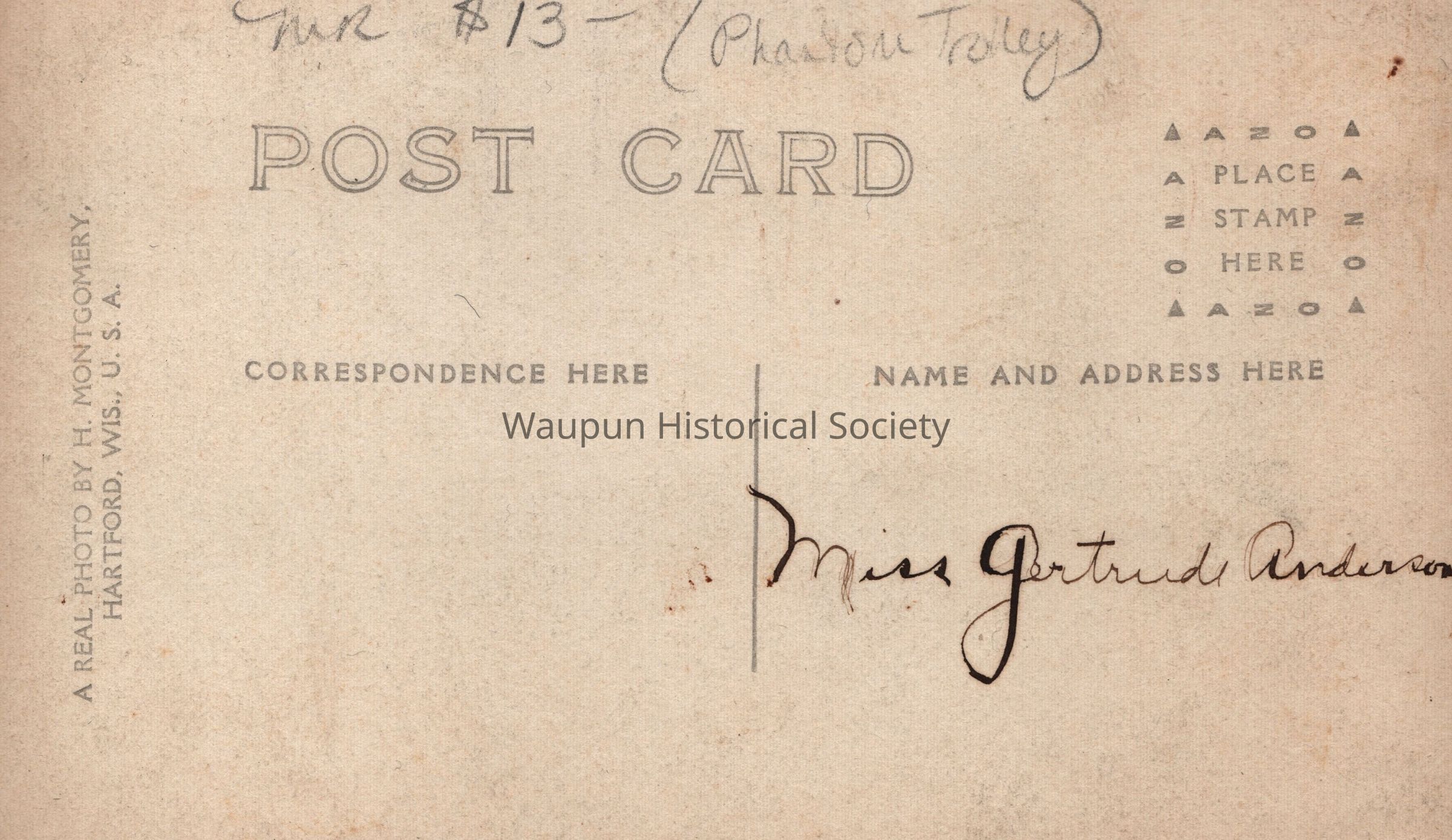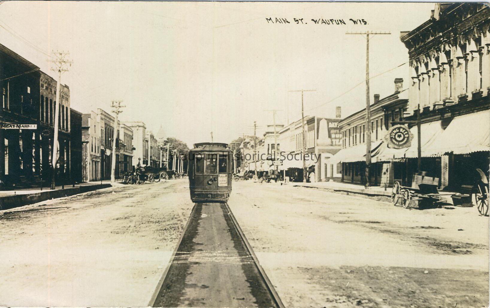 Postcard, Phantom Trolley, Main Street Waupun, WI. This comic postcard shows a non-existent street car going down the middle of main st.Acquisition