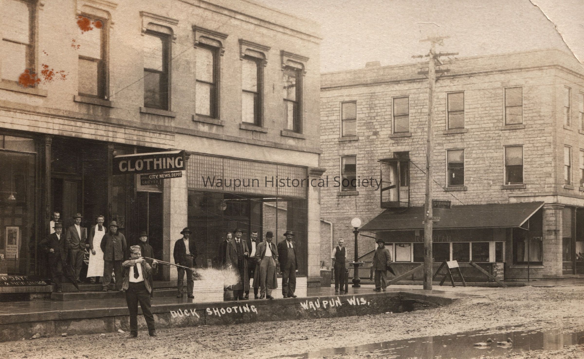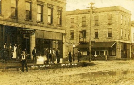 Postcard, Main Street Waupun, Comic man shooting duck in street.Acquisition