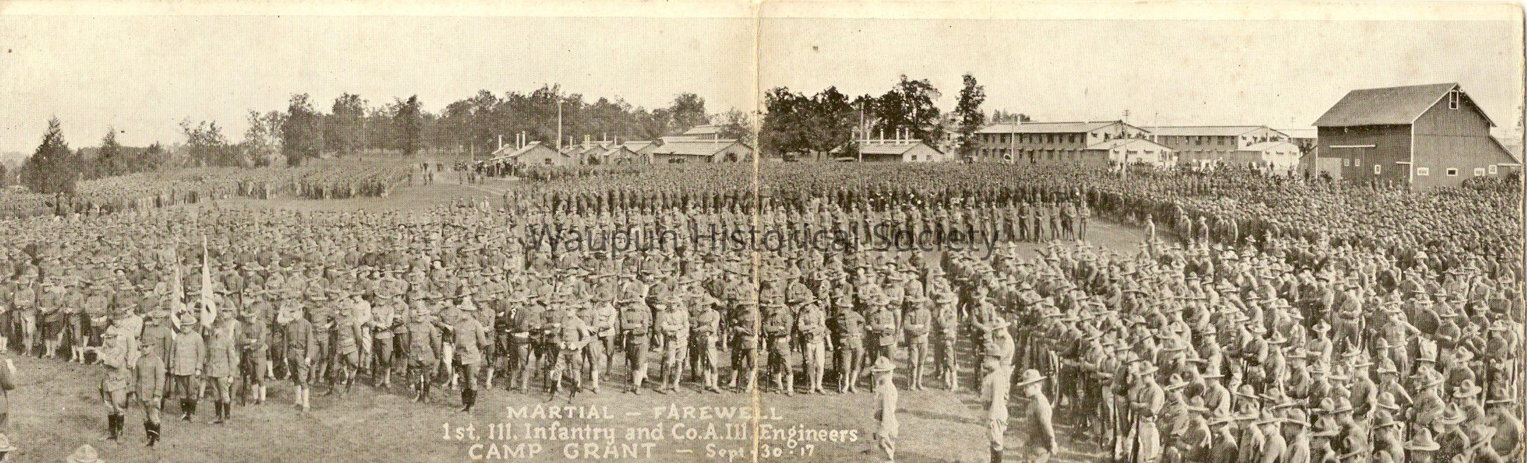 Four section, panoramic photo postcard dated September 30, 1917 MARTIAL - FAREWELL featuring the 1st. (Ill or 111) Infantry and Co. A. (Ill or 111) Engineers, Camp Grant. Shows massive troops in formation with barracks and other buildings of the camp.