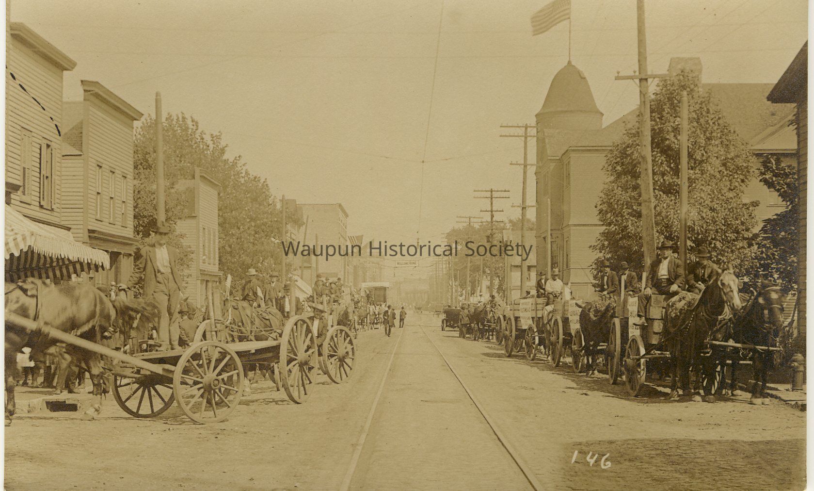Welcome Home Parade. Parade held to celebrate the Home Coming in July of 1908. On the back of this postcard it reads: "Johnson Post Card Works, Waupun, W" Jim Laird thinks this is not Waupun.Acquisition