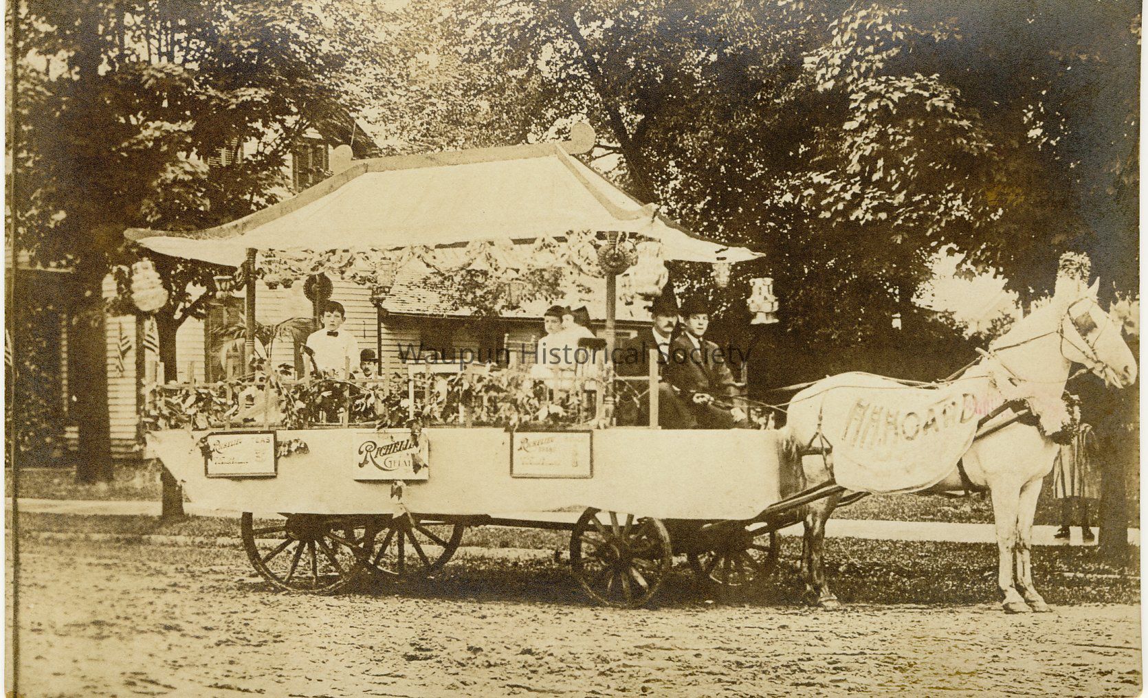 The signs on the side of the wagon are too light read or are partially covered. However the middle sign reads in part: Richelle Gelat (in?)" The sign furthest to the left may read: Richelle Peas.
