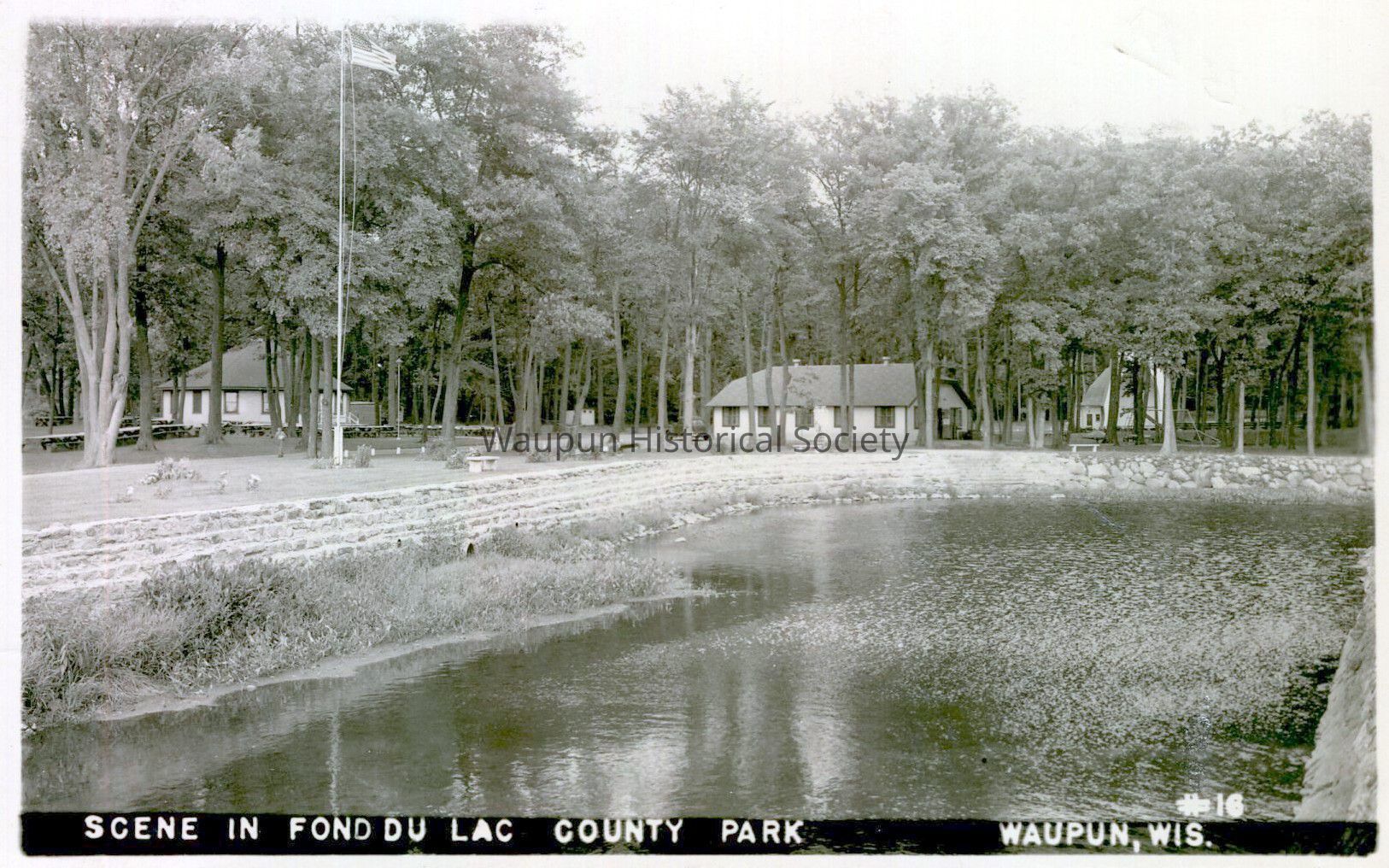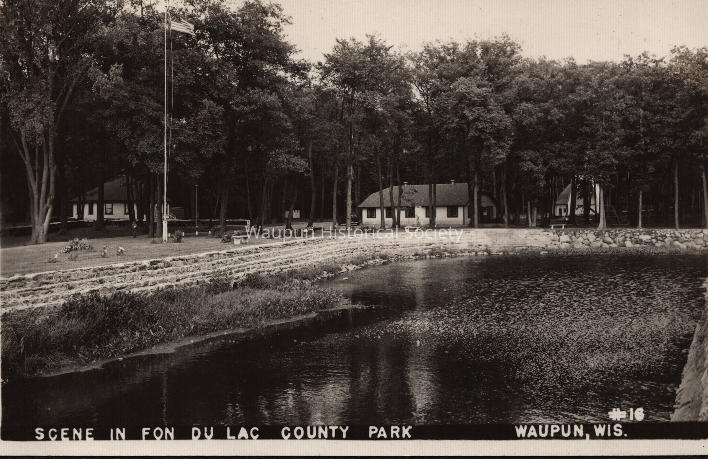 Postcard, Parks, Fond du Lac County Park, #16. The Fond du Lac County Park is located at the North West end of Waupun. The park for many years was virgin woods. It contained a band shell and a WPA Project stone work along the river. This card is postmarked Aug. 16, 1953Acquisition