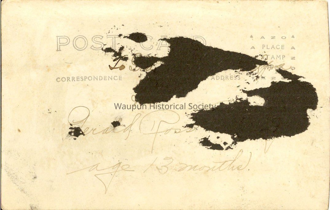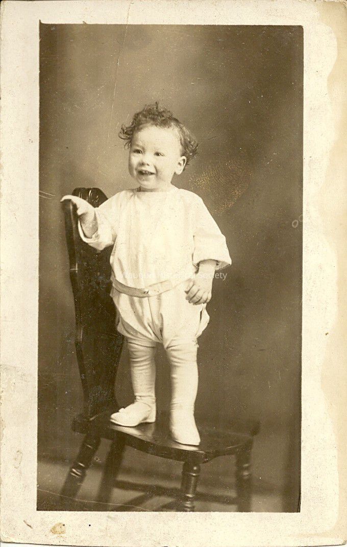 Photo postcard measuring 3 1/2 "x 5 1/4" black and white picture of a toddler posed standing on a chair. Writing on the correspondence side indicates Gerald Ross _________. Age 13 months. Due to the post card having been placed in a photo album and then removed, some of the black page stuck to the card, obscuring enough as to not be able to identify the last name. No date is indicated.