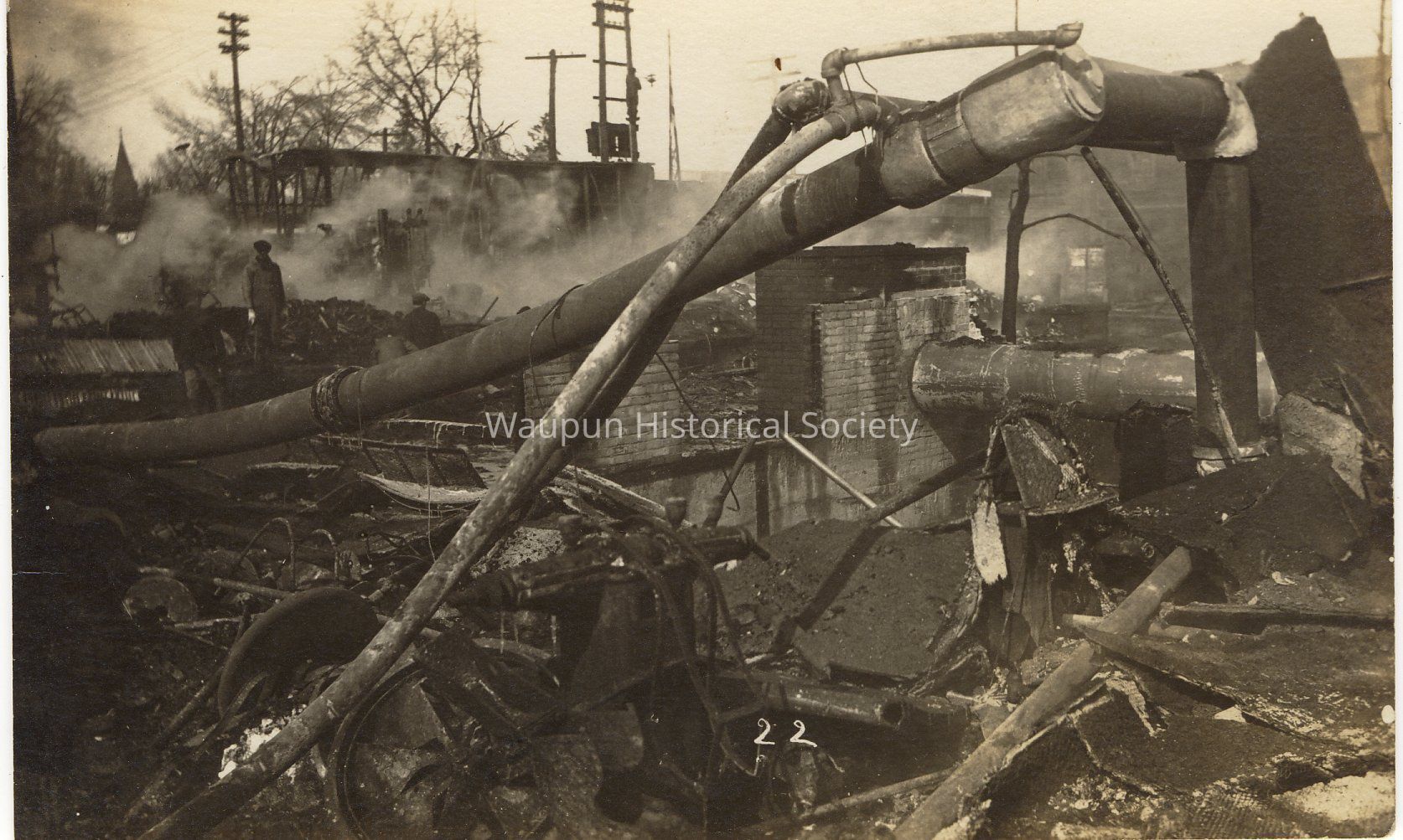 Aftermath of the C.A. Shaler Company Fire. One of 13 Black & White picture postcards showing the aftermath of the March 2, 1922 Shaler Co. fire. The fire which struck at about 4:15 p.m. completely destroyed the buildings and most of the machinery and took the lives of three women employees. The victims were Bessie Koekoek, Mrs. Howard Carney, and Mrs. Emma Michels. The fire caused an estimated loss of over a half a million dollars to the Shaler Co. and another $20,000 to the Althouse-Wheeler Co.; $4000 to the neighboring Beucus home, and still another $5000 in other loses.Acquisition
