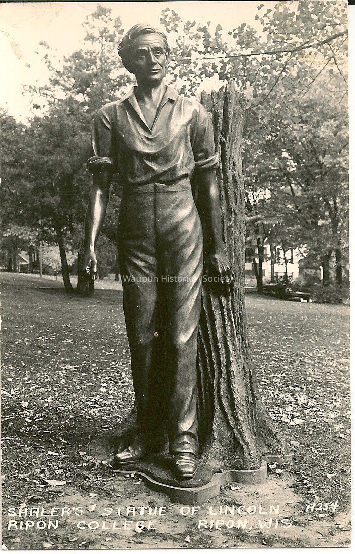 Shaler's Lincoln Statue postcard. This statue is on the campus of Ripon College, Ripon, WI. The statue was cast and presented to Ripon by its creator, Clarence Addison Shaler. Shaler created Lincoln as a young man.