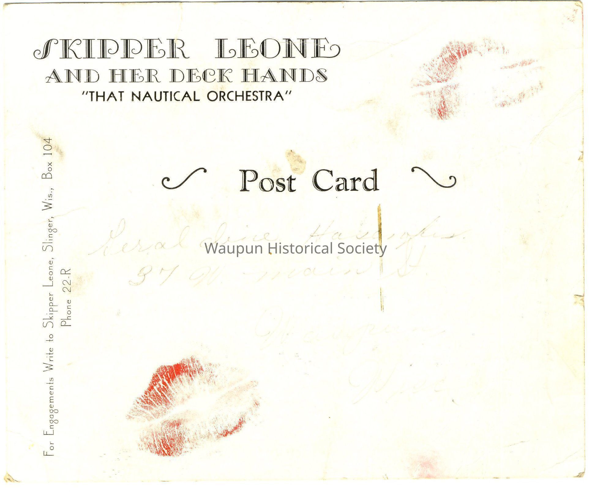 Description of photo postcard: SKIPPER LEONE AND HER DECK HANDS "That Nautical Orchestra" - shows 4 men sitting, holding a musical instrument and 2 women, 1 playing an accordian and one standing by the microphone. The bass drum has a picture of ship and the name SKIPPER LEONE on it. In the upper right corner is a small photo of "IK" the Farmer's Friend, a man standing by the WIBU microphone.