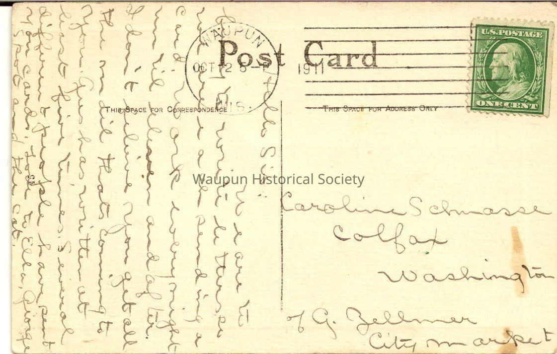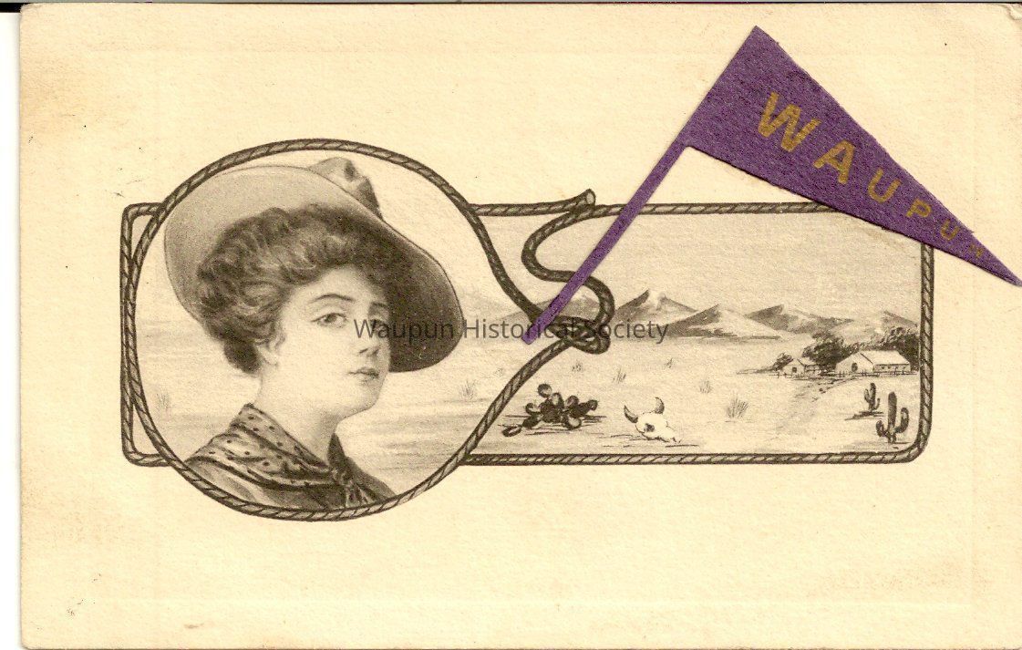 1- PostCard of a lady with a rope around the picture and a Purple flag of Waupun the picture of Caroline SchmasseAcquisition