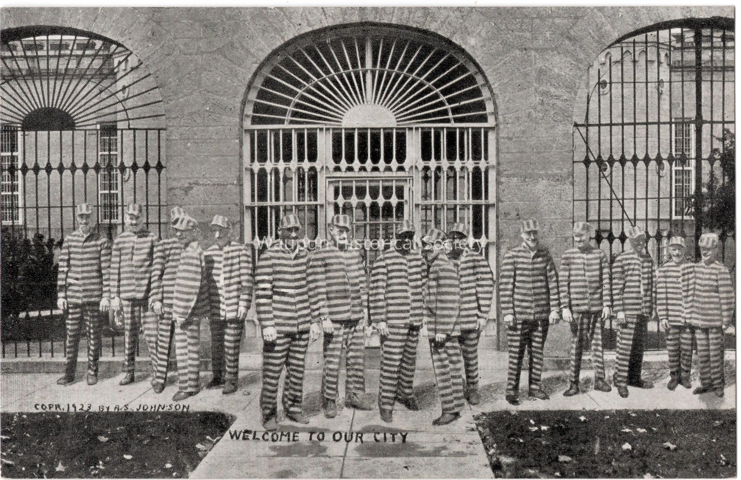 Credit James "Skip" Brown for (6) Johnson prison postcards featuring inmates in striped uniforms.