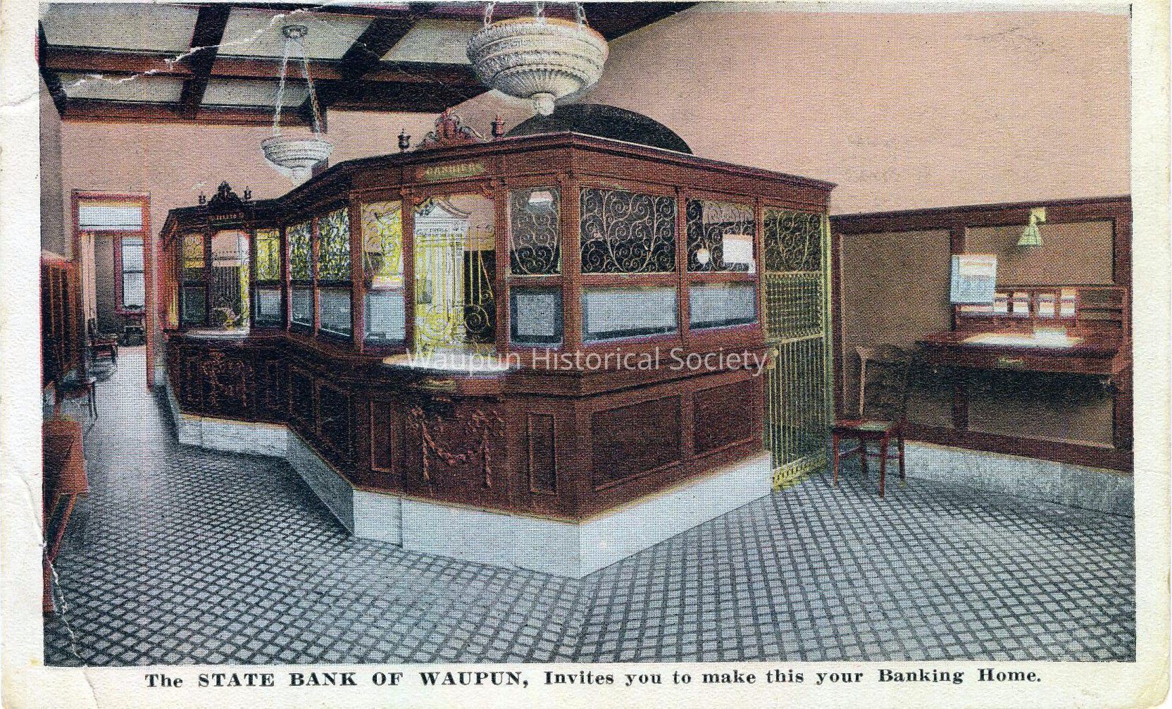 State Bank of Waupun Postcard. This colorized postcard issued by the State Bank of Waupun, shows the interior of the bank and on the reverse side lists the bank officers and board of Directors and toal Resources and Liabilities.Acquisition