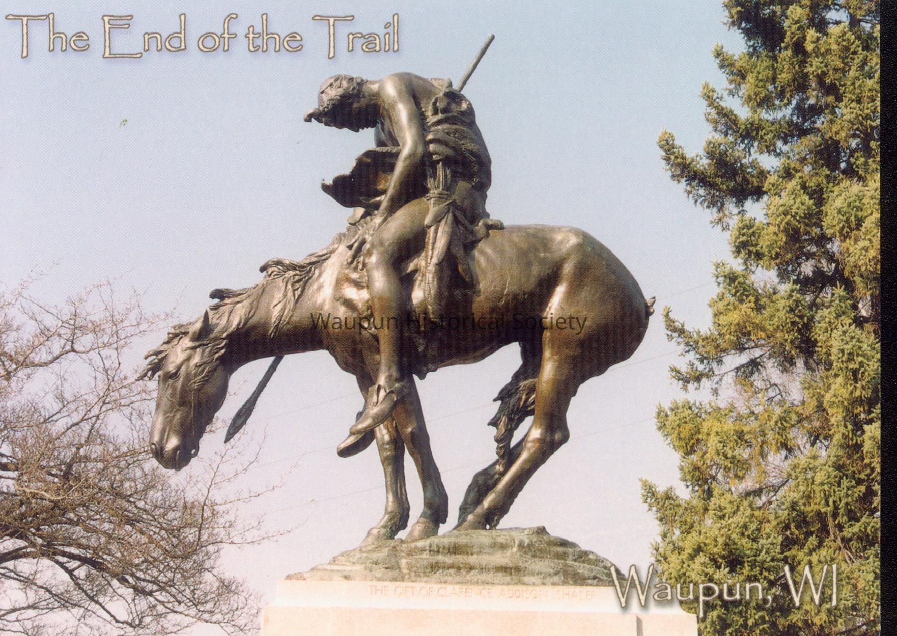 Inscription on back: The End of the Trail. Created as a tribute to the American Indian by James Earle Fraser (1876-1953) when only 17. His twice life-sized plaster replica gained word fame at the 1915 San Francisco Exposition. Clarence Shaler, Waupun industrialist, comissioned this first bronze casting. Dedication was on June 23, 1929. Chief John Big Tree, Fraser's model, was the honored guest at Waupun's 125th Jubilee July 1-4, 1964.Acquisition