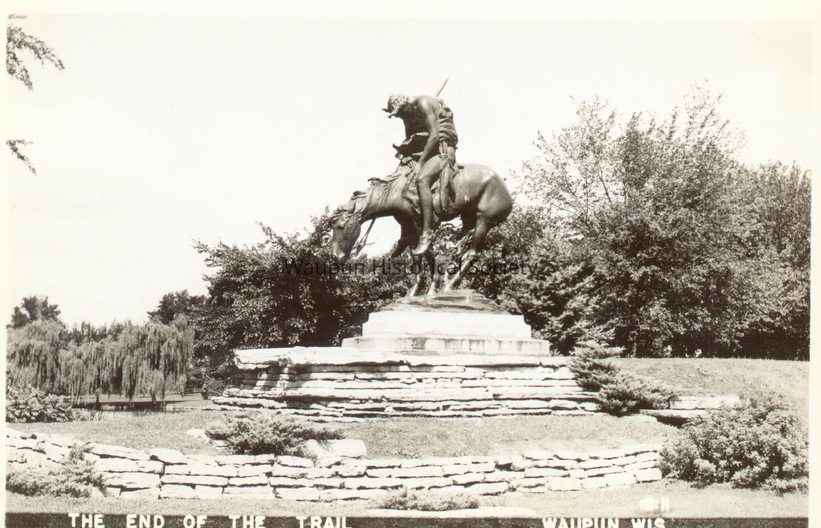 Picture of "The End of the Trail" statue. This statue was given to the city by Clarence Shaler. The statue was created by James Earle Fraser (1876-1953). The statue was dedicated in Waupun on June 23, 1929.