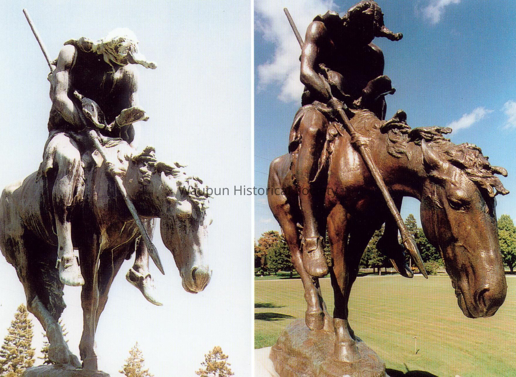 Picture of "The End of the Trail" statue. This statue was given to the city by Clarence Shaler. The statue was created by James Earle Fraser (1876-1953). The statue was dedicated in Waupun on June 23, 1929.