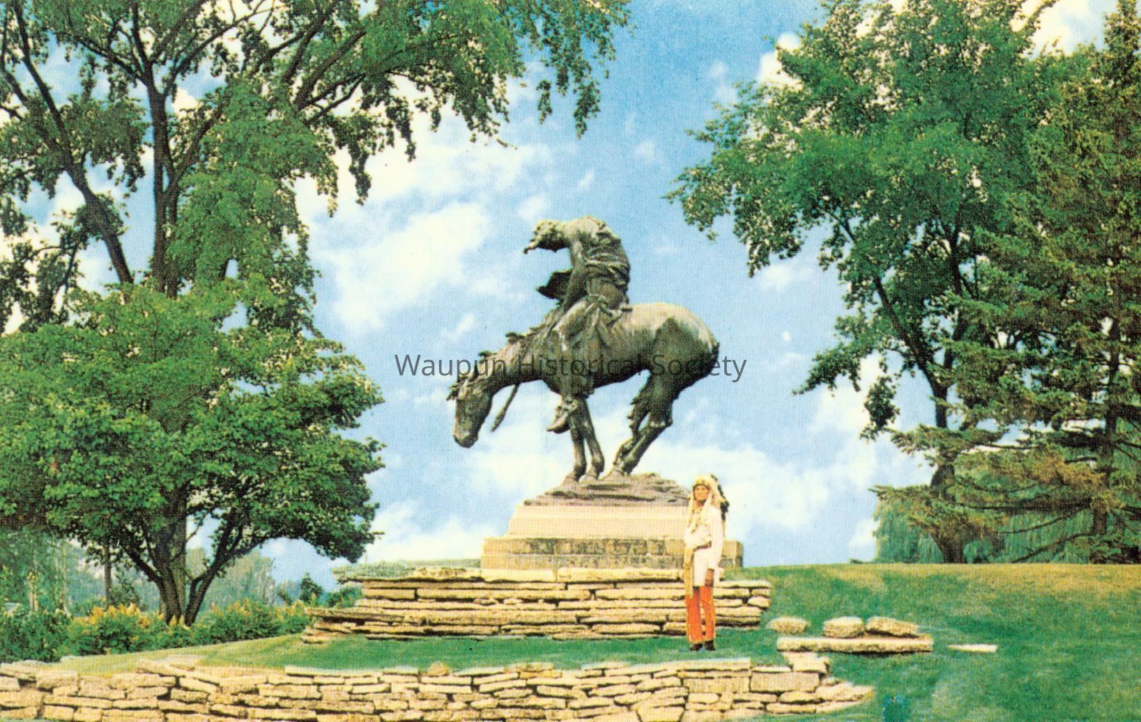 Postcard of "The End of the Trail" statue. The following is on the back of the card: "This is the original bronze cast of the End of the Trail, sculptured by James Fraser and presented to Waupun by Clarence Addison Shaler. It is located in Shaler Park. Chief John Big Tree posed for Mr. Fraser in 1913. At the age of 98 he again posed in front of the statue."