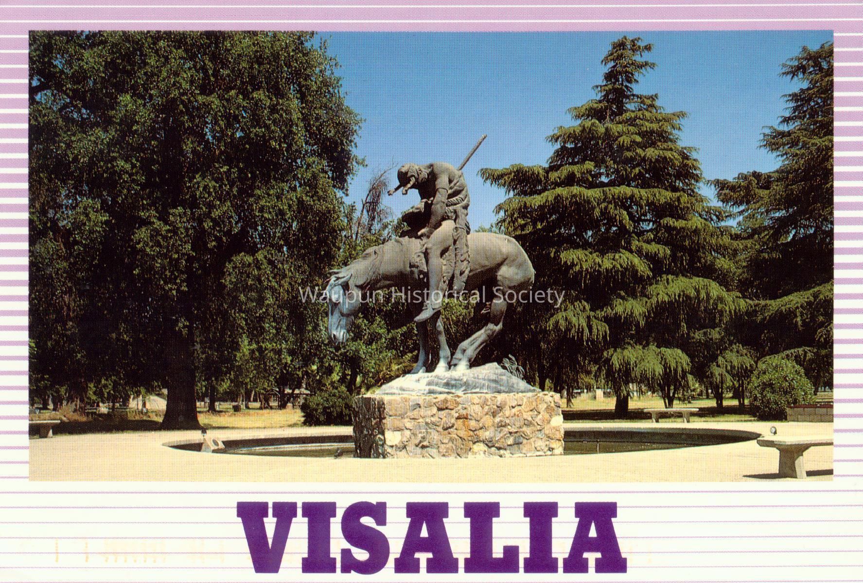 Postcard of "The End of the Trail" statue. This is not the Waupun End of the Trail. This statue is in Visalia, CA. It was cast from the "End of the Trail" that was on display at the Panama Pacific Exposition. The city of Visalia permitted the Cowboy Hall of Fame in Oklahoma City, Oklahoma to dismantle their statue, make this bronze casting, and place the Panama Pacific Statue in the Cowboy Hall of Fame Museum. This is the Mooney Grove, Visalia, CA statue.