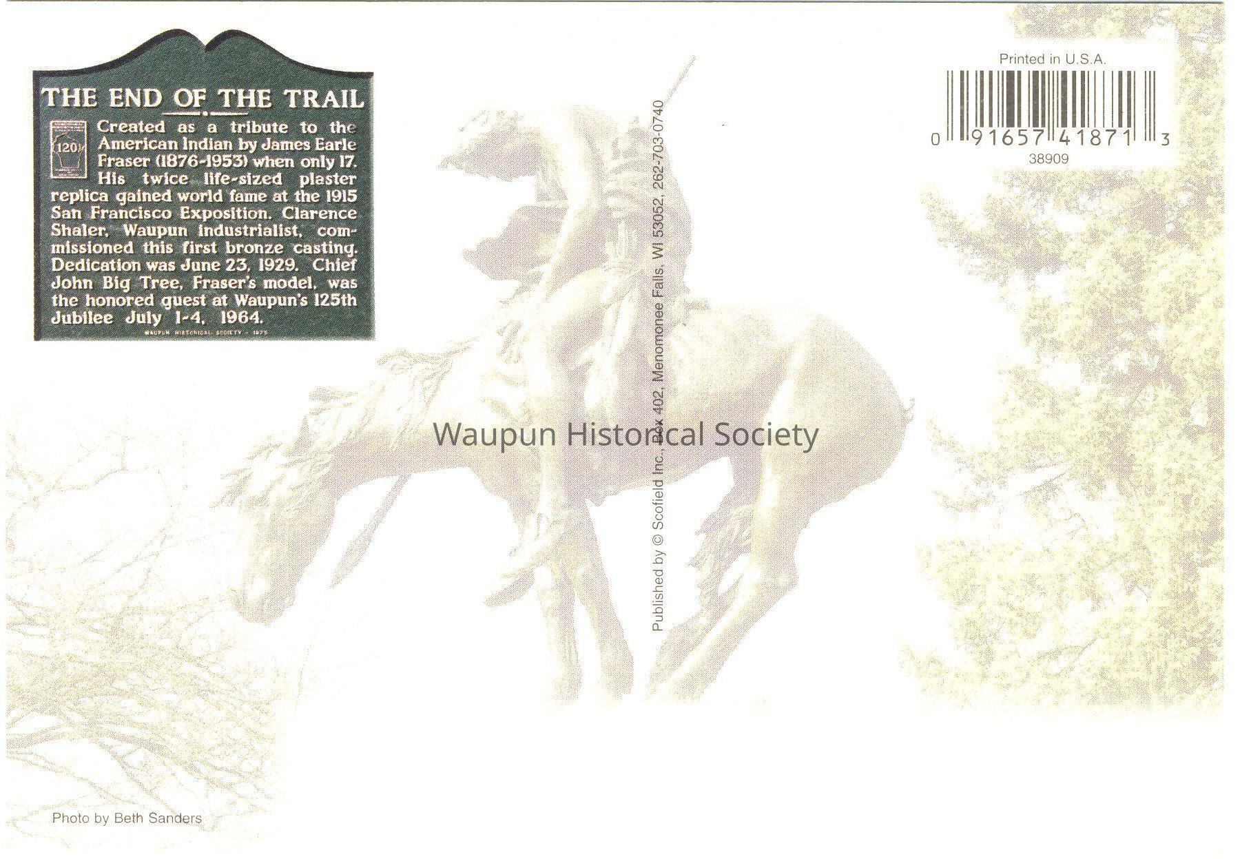 Postcard The End of the Trail. Description typed on back as follows: Created as a tribute to the American Indian by James Earle Fraser (1876-1953) when only 17. His twice life-sized plaster replica gained world fame at the 1915 San Fancisco Exposition. Clarence Shaler, Waupun Inductrialist, commissioned this first bronze casting. Dedication was June 23, 1929. Chief John Big Tree, Fraser's model, was the honored guest at Waupun's 125th Jubilee July 1-4, 1964.