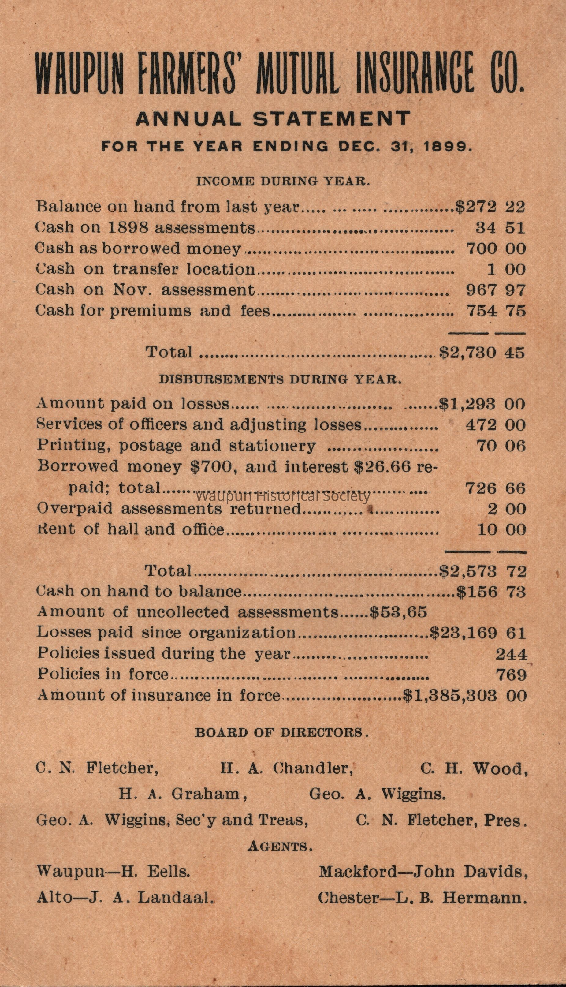 Postcard, Waupun Farmers' Mutual Insurance Company, Year Ending December 31, 1899Entry/Object ID